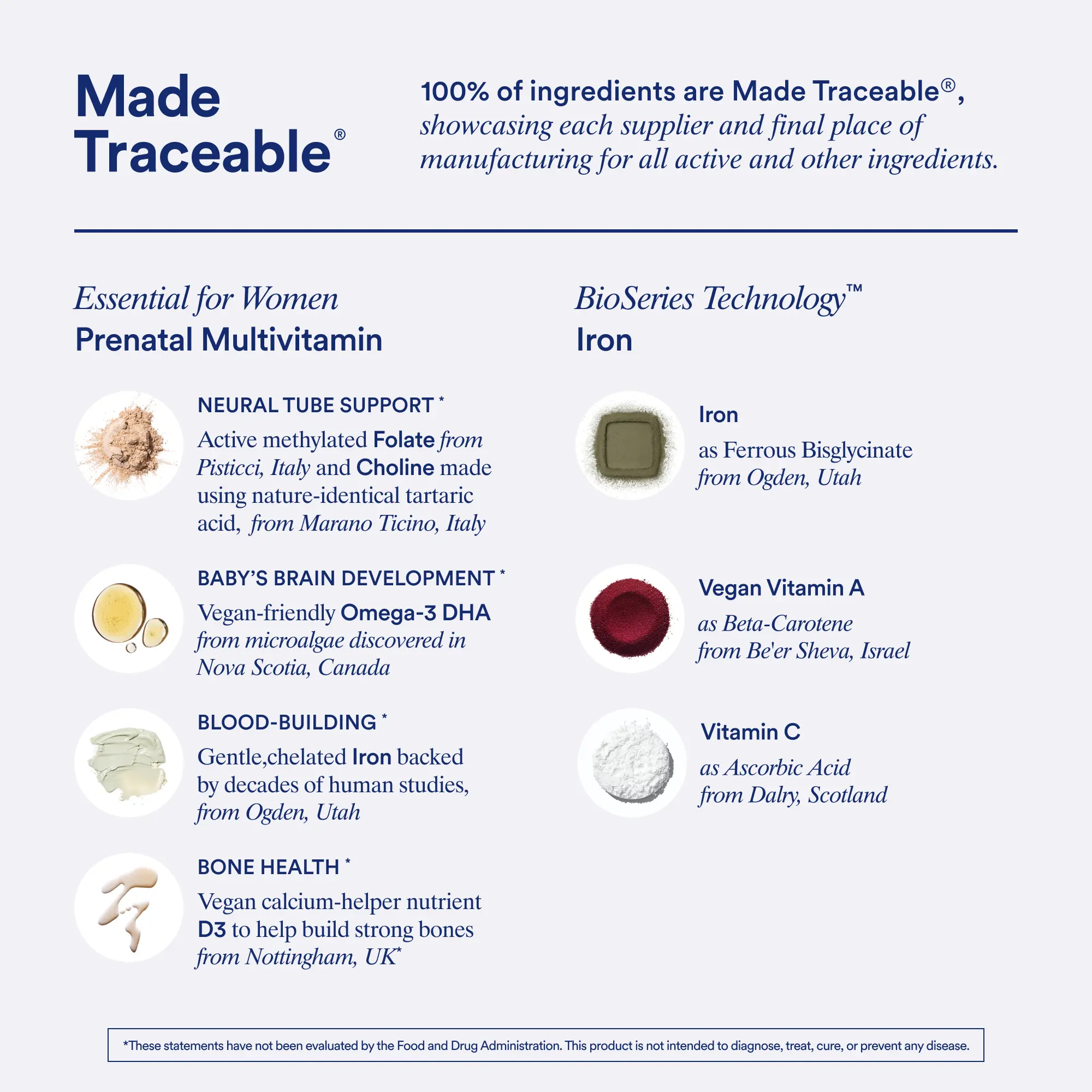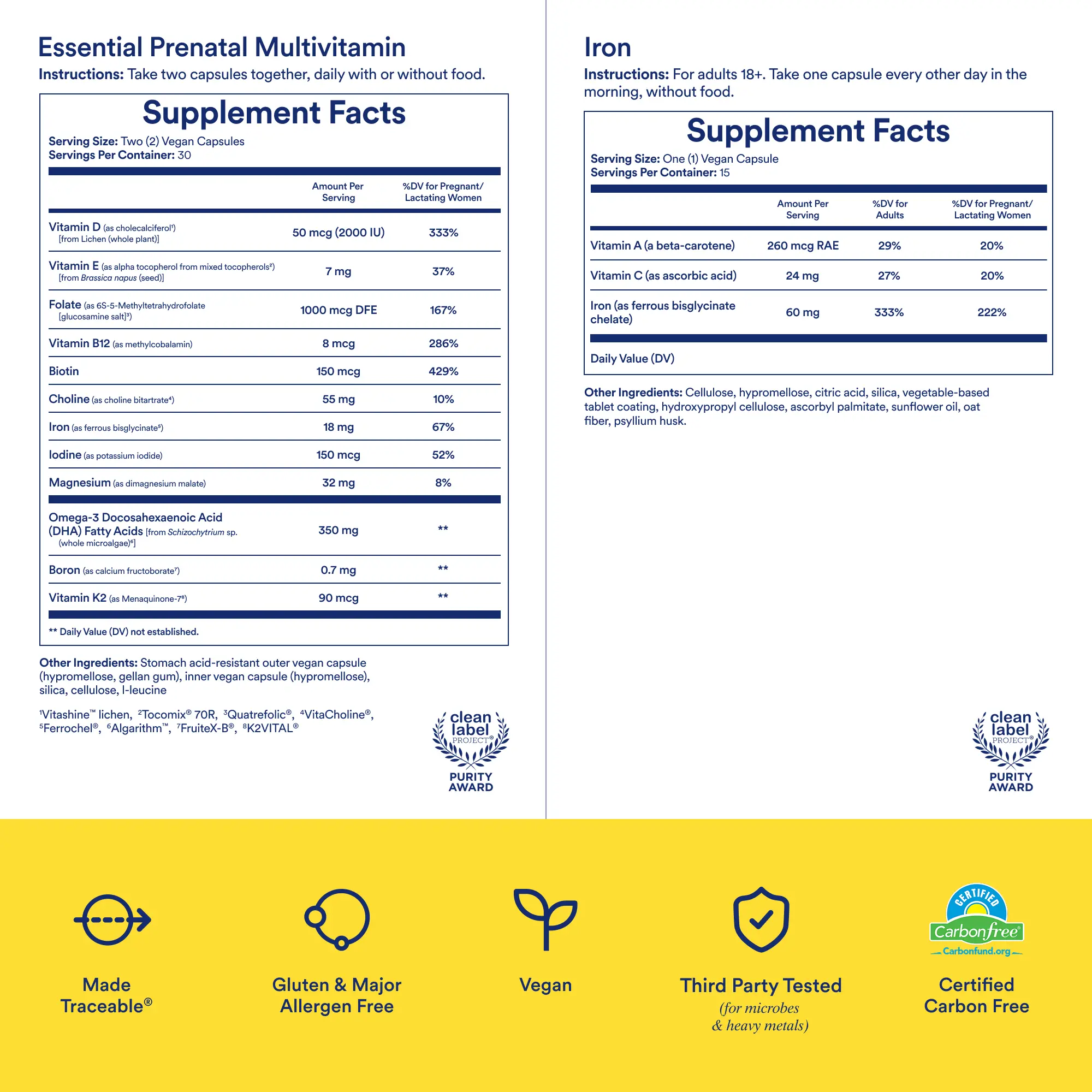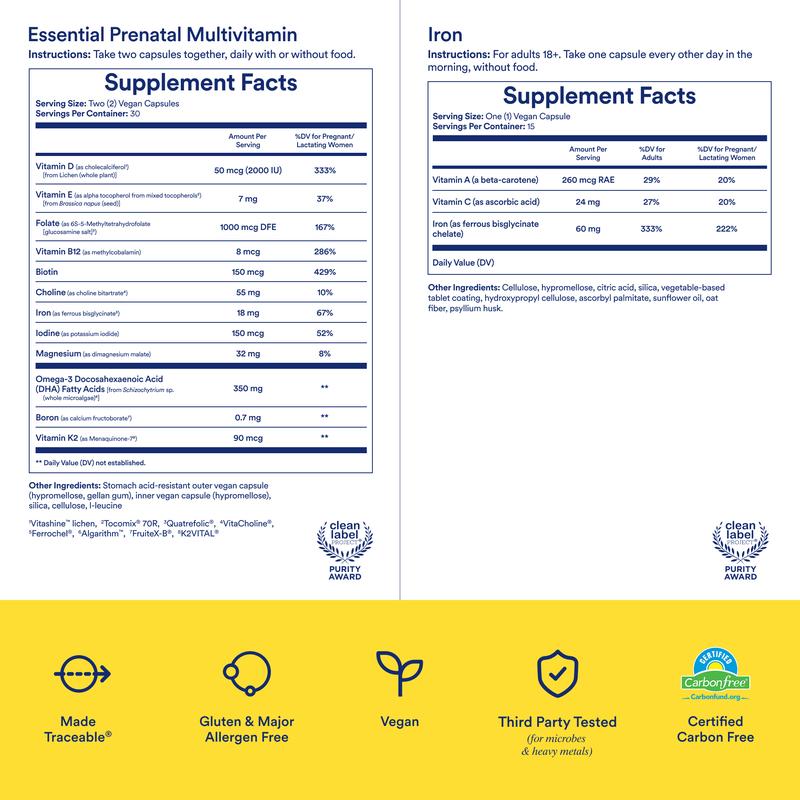 ·INGREDIENTS: Ritual Iron BioSeriesTM is formulated with an alternate-day dose of 60 mg bioavailable iron as ferrous bisglycinate, designed to release gradually over 6 hours, and includes Vitamins A and C to support Iron absorption. Ritual’s Essential Prenatal Multivitamin features 12 traceably-sourced ingredients for Mom and Baby, including Folate and Choline for neural tube development and calcium-helper nutrients D3, K2, and Boron.*