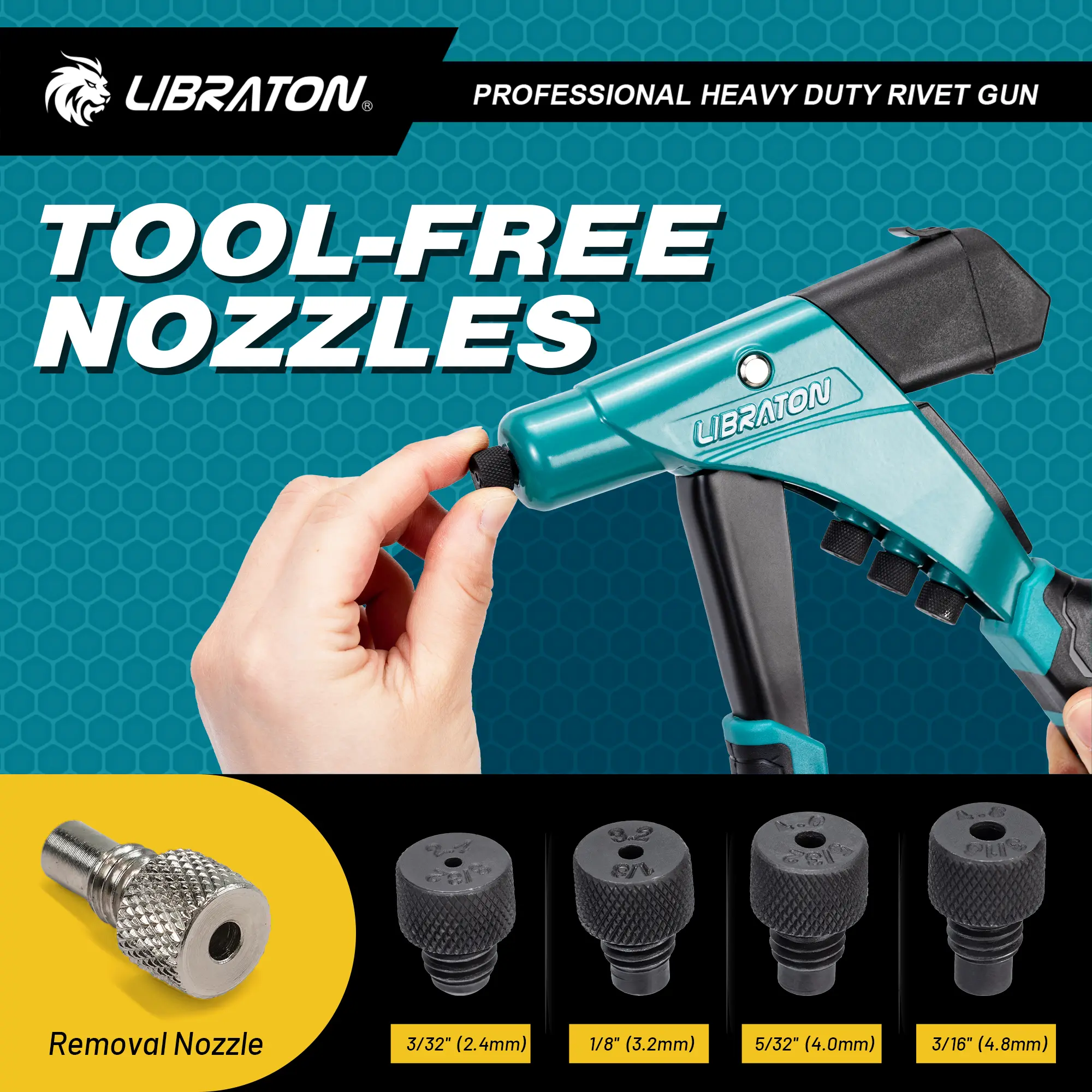 ·SAFE & CONVENIENT USE: The professional riveting tool has a safety lock for safe storage and a shaft container for storing rivet shafts after the rivet work is completed. Comes with a blow-molded box for easy storage and carry. With 4 tool-free interchangeable nozzles 3/32"(2.4mm), 1/8"(3.2mm), 5/32(4mm), and 3/16"(4.8mm) for easy replacement and maintenance.