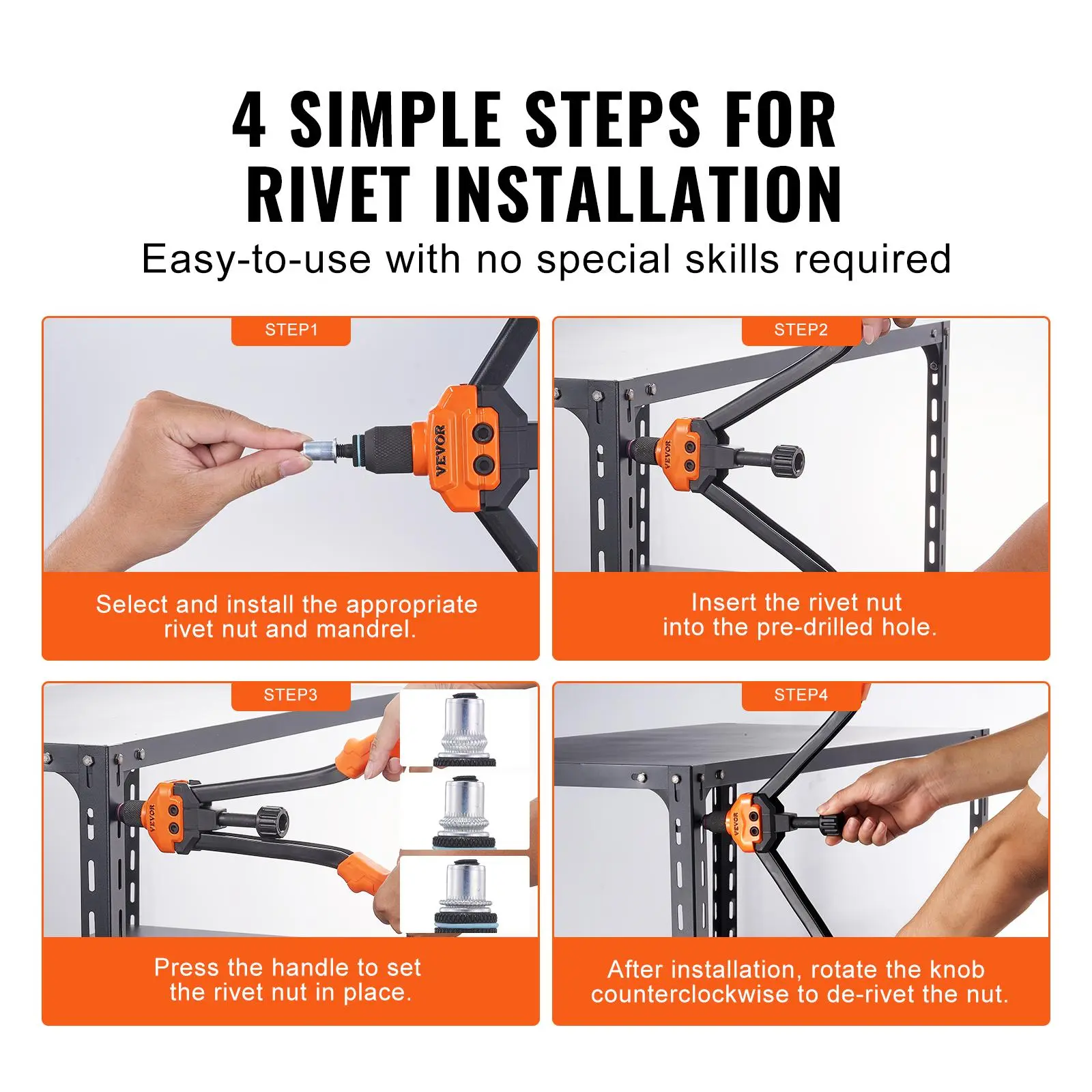 • Easy to Use: Our user-friendly nutsert tool kit requires no complicated operations. Just replace the appropriate mandrels and rivet nuts, and there's no need for any additional tools. Simply open and close the handle to complete the nut installation, and twist the knob to de-rivet. Even first-time users can use it like professionals.