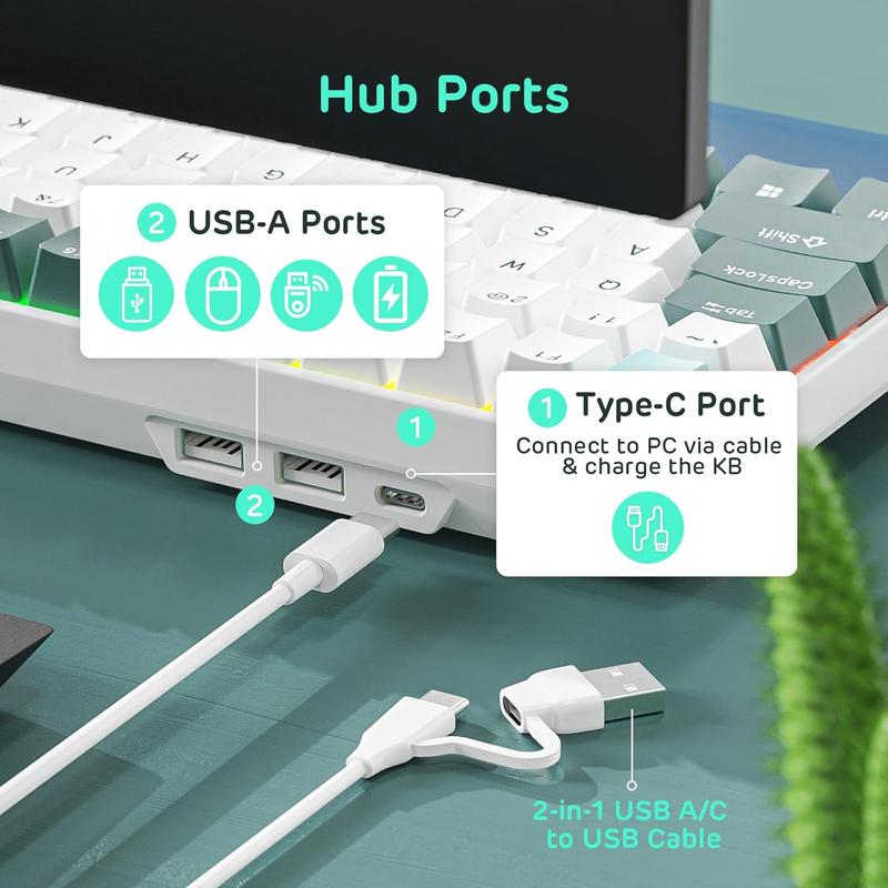 ·Hub Design - This wireless mechanical keyboard is armed with 2 built-in USB pass-through ports and 1 Type-C Port, allowing to back up more facilities, like a mouse or a headphone.