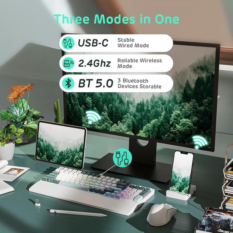 ·BT5.0/2.4G/USB-C - Believe it or not, this is the first generation of three-mode wireless keyboards. Wireless mode with stable Bluetooth 5.0, hassle-free 2.4Ghz dongle plus USB-C wired mode set no limits about your keyboard connection.