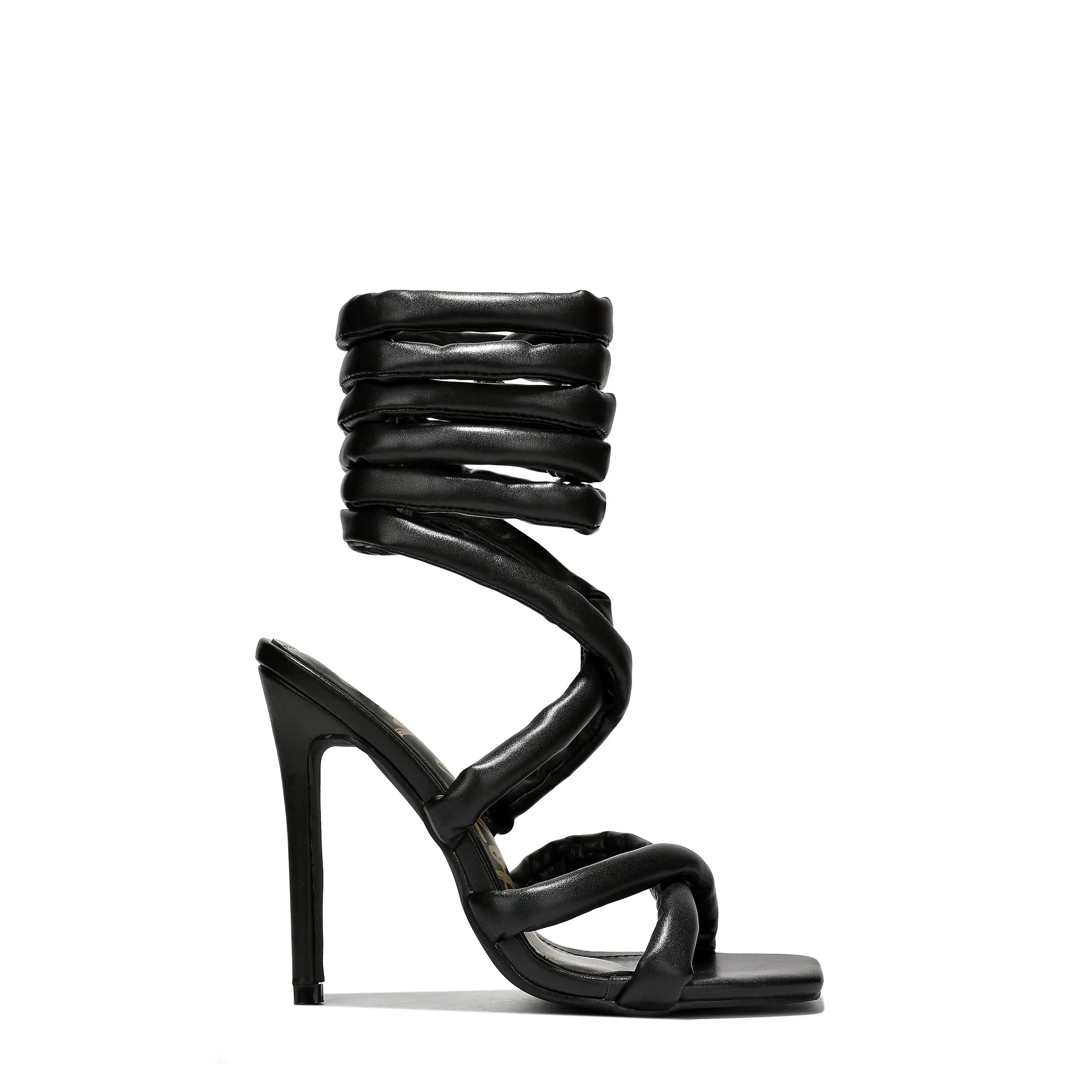 Elevate your evening wear with the Roberta heel, a masterpiece of modern sophistication and daring design. These heels are defined by their plush, padded tubular straps that artfully crisscross the foot before wrapping sensuously up the ankle for a customized, dramatic effect. The soft, cushioned texture offers a surprisingly comfortable embrace, ensuring you stride with confidence.