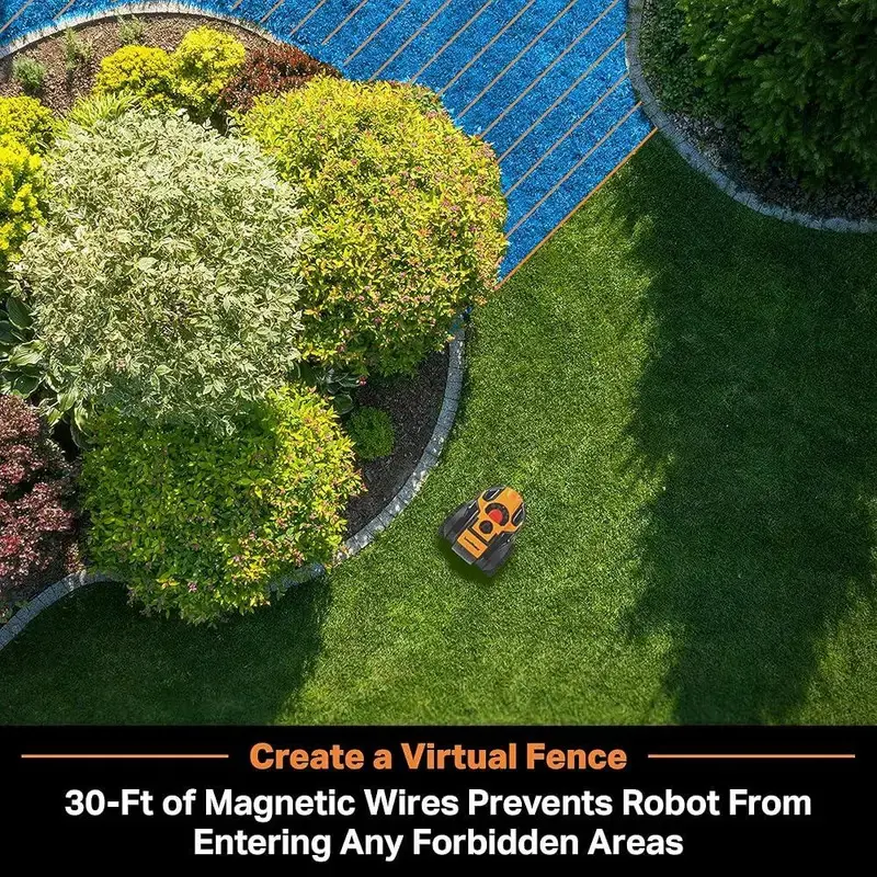 About this item Optical Navigation Technology: No more guesswork in the yard. Our robotic lawnmower uses sensors and wide-angle, high dynamic range cameras to identify grass even in extreme contrast lighting conditions, allowing the robot to navigate effectively on the lawnDesigned for Small Lawns: Cuts grass for up to 3 hours, covers 2000 square feet while scattering small grass clippings on the lawn to feed the grass. For larger yards, additional batteries can be purchased separatelyObstacle Avoidance: Two ultrasonic sensors detect obstacles and automatically redirect the robotic lawnmower to avoid obstacles as small as 6 inches. No-Pass Function: Use the included 33-foot magnetic wire to create virtual fences in your yard. Easy to set up, no power or digging required, and prevents the robotic lawnmower from entering any restricted areas. Climbs slopes up to 35%°Deep Tread Tires and Powerful Drive System Grasp Slopes, Easily Handle Complex Lawns. Instant Start: No Need for Outdoor Power Sockets or Setup Applications. Simply Place the Robot Lawn Mower on a Suitable Lawn Size, Press the Start Button, and It Will Begin Working. Optimal Effect: Clear Lawn Edges Prevent Mower from Deviating from Lawn. Adjustment of Lawn Edges May Be Required; Like Other Robot Lawn Mowers, a Lawn Trimmer Should Be Used to Trim Lawn Edges