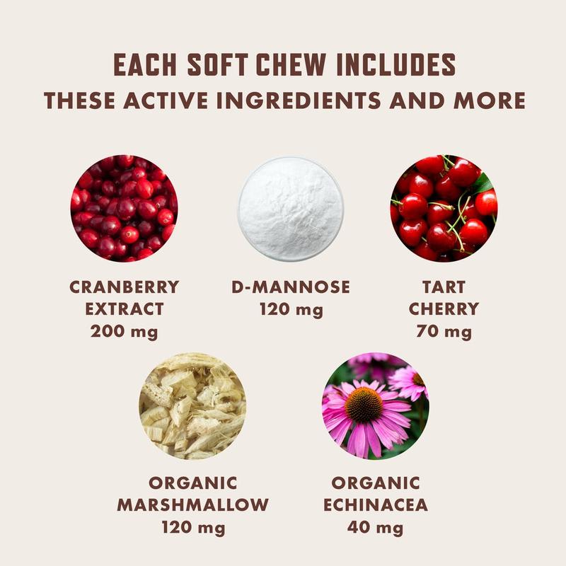 Active Ingredients Per Soft Chew (4G) Cranberry Extract (Vaccinium macrocarpon) 200mg D-Mannose Birch Bark Extract (Betula Platyphylla) 120mg Organic Marshmallow Root (Althaea officinalis) 120mg Dandelion Root (Taraxacum officinale) 80mg Tart Cherry (Prunus cerasus) 70mg Organic Echinacea Root (Echinacea purpurea) 40mg