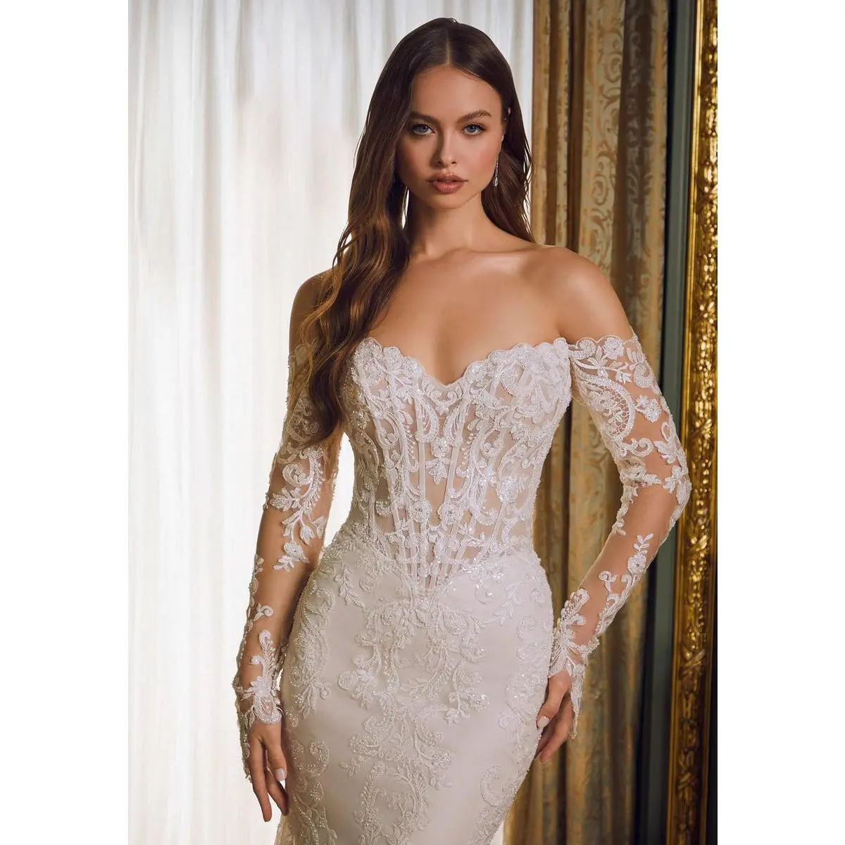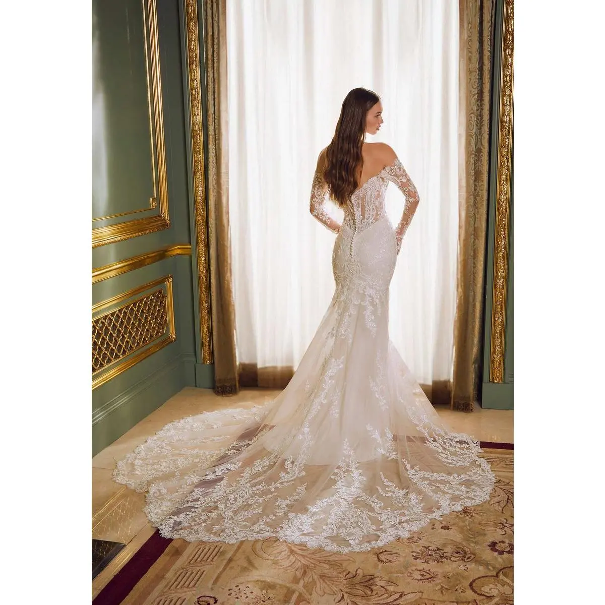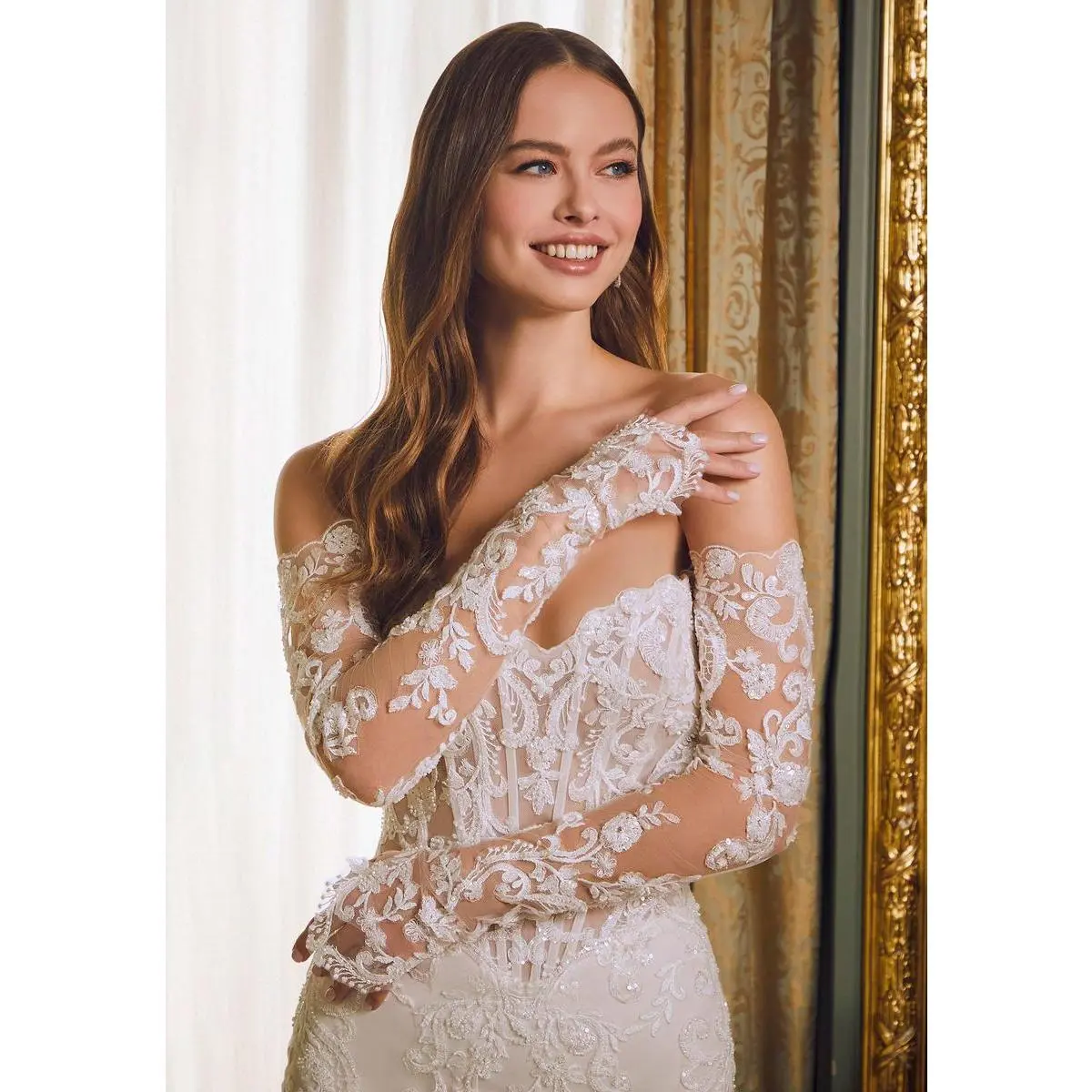 Exude glamour on your wedding day with the Morilee Rochelle designer wedding dress. This fit-and-flare gown stuns with intricate details that flatter and elongate your figure. The sheer bodice, featuring couture boning, draws the eye down to the basque waist, creating a beautifully cinched silhouette. Swirling frosted, medallion embroidered lace adorns the entire dress, adding a touch of elegance and whimsy. The lace accentuates the romantic sweetheart neckline and cascades down the stunning sheer train, which boasts a delicate scalloped hemline for a truly unforgettable look.The Morilee Rochelle (style 2647) offers two stunning looks in one. For a touch of timeless elegance, add the matching detachable long sleeves, which are included with the dress. These sleeves provide a touch of coverage and can be easily removed to showcase the full drama of the open back design. With its exquisite craftsmanship and versatility, the Rochelle is a wedding dress that will leave a lasting impression on your special day!