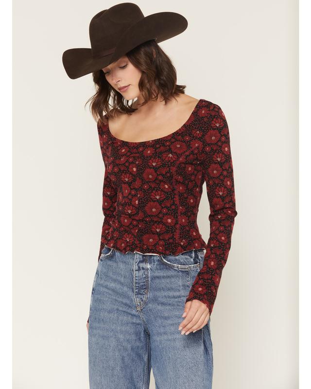 Model is 5'10" wearing a size medium. 60% cotton / 40% polyester. Scoop neckline. Long sleeves. Cropped styling with ruffled hem. Black with red floral print throughout. Lower back with criss cross design. Machine wash cold, tumble dry low. Imported.