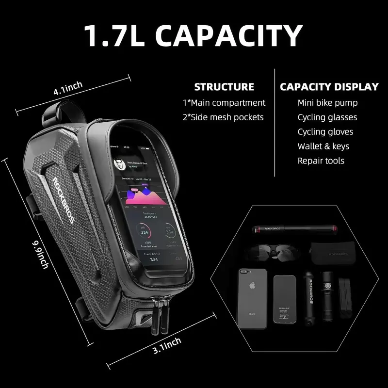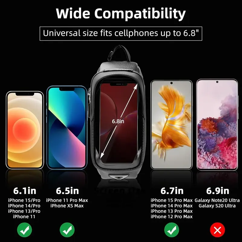 ·Large Capacity:Big room design is enough to storage your daily riding items,such as cell phone, sunglasses, power bank, battery, gloves, energy gel, small mini pump repair kits, keys, wallet and so on, mesh compartments on two sides are designed to classified storage.Perfect compatible with Android/iPhone cellphone Under 6.8 inches