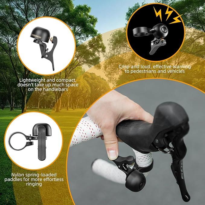 ·Compact and Lightweight: Weighing only 43g, its slim design doesn’t take up much handlebar space, and the nylon spring lever makes our bike bell effortless to ring.Ideal for carbon fiber road bikes & commuter bicycles.