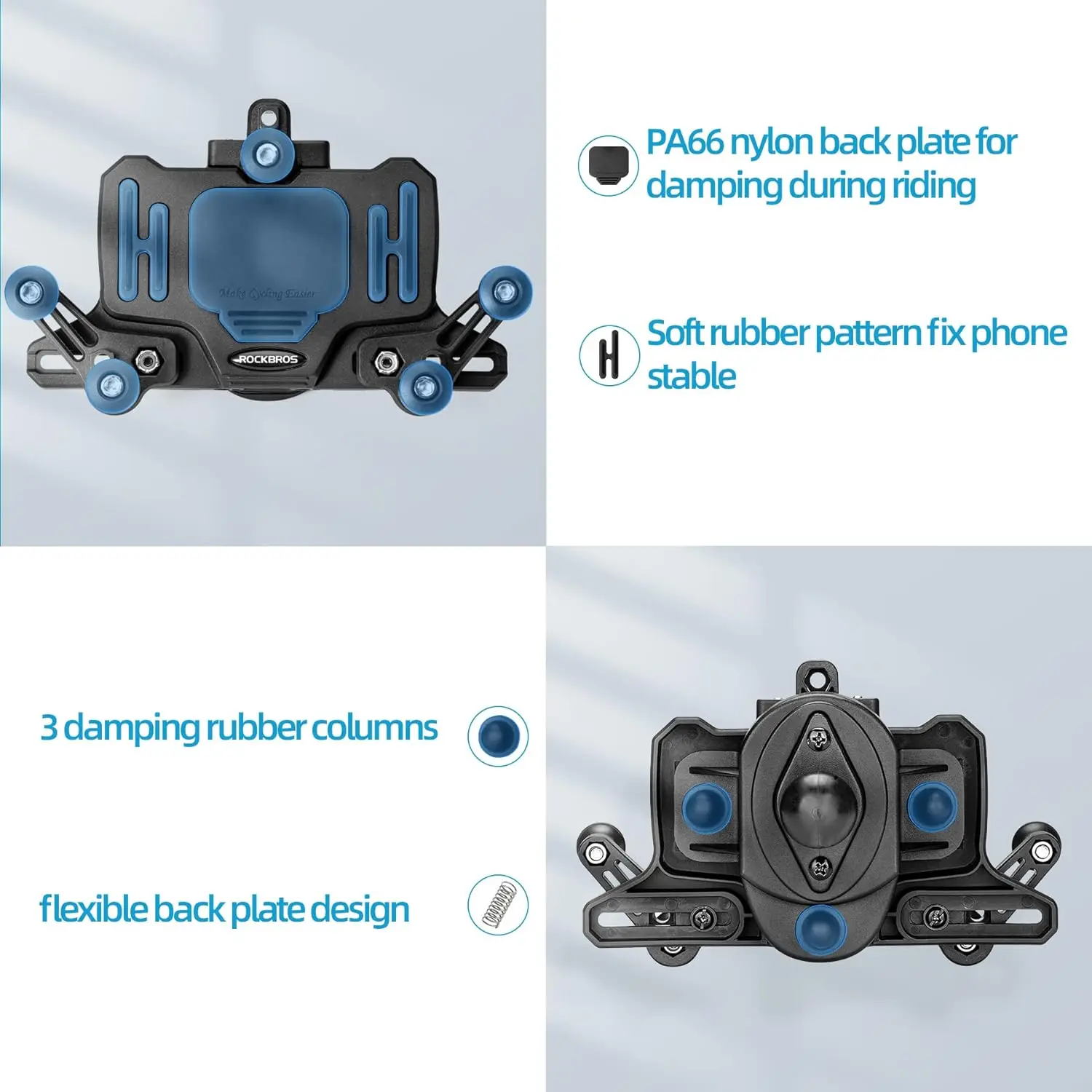 【Upgraded Shock Absorbing】New-generation shock absorption technology gifts it higher shock absorbing performance for protect the OIS camera on phones. There are 4 shock-absorbing rubber columns designed on this phone mount to reduce the shock from all directions produced during cycling, which also makes phones more stable