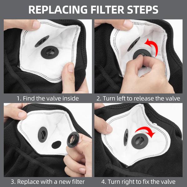 Activated carbon filters offer added protection against dust and cold wind. Perfect for outdoor activities, it keeps you safe from particles and chilly winds.