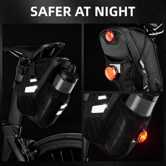 ·TWO TAILLIGHT LOOPS: Reflective on bottle holder pocket and two available taillight loops. A small tail light can also be mounted on the back of the saddle bag for enhanced safety and visibility. (The tail light&water bottle don't include in the package).