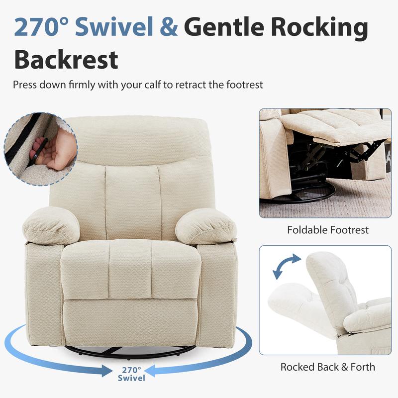 ·【Enhanced Support & Stable Construction】Designed with a foam-and-spring seat cushion, this swivel recliner provides long-lasting support and superior comfort. Built with a multilayer board and reinforced iron frame, it delivers exceptional durability and stability. Weight capacity: 380 lbs, ensuring secure seating for a wide range of users.