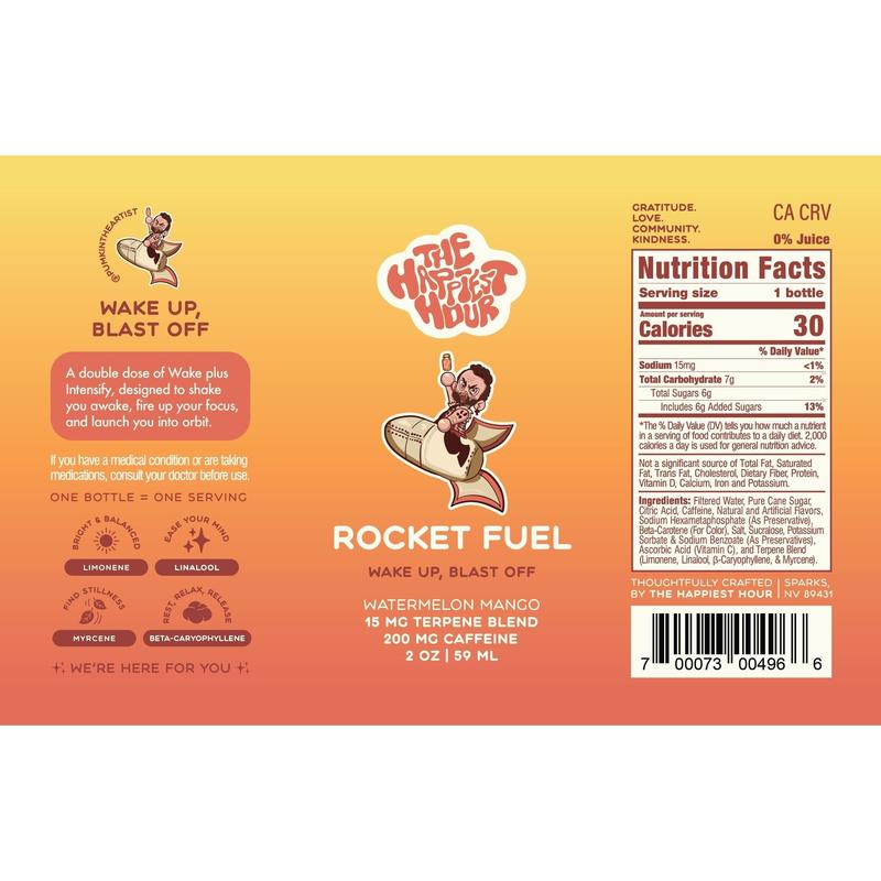 Meet Rocket Fuel, the ultimate Watermelon Mango Terpene Blend designed to shake you awake and fire up your focus. A double dose of Wake plus Intensify, this 2oz energy shot launches your mind and body into motion with 200mg caffeine and 15mg terpenes for powerful, clean energy in a smooth tropical flavor.