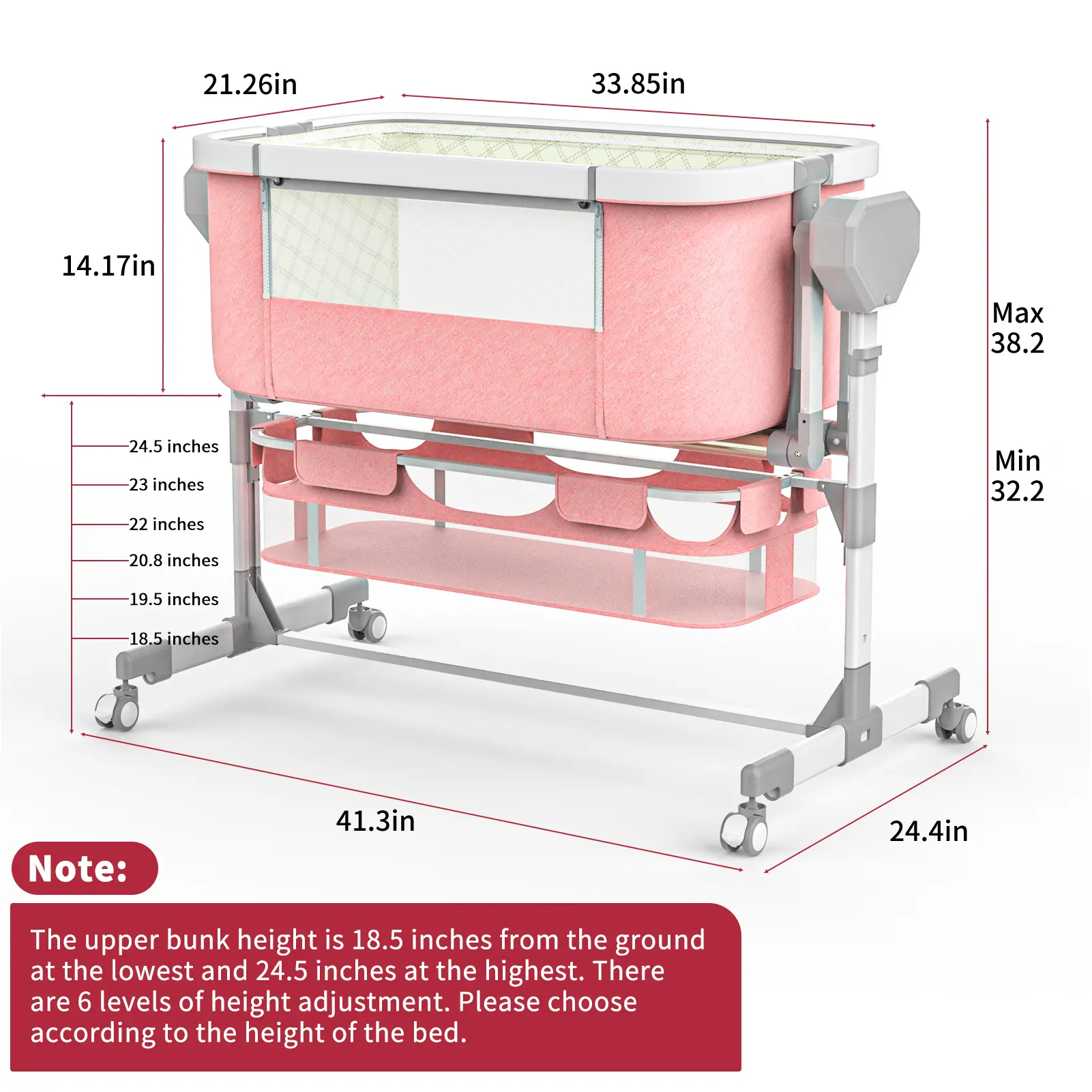 【 6 height adjustmentsand/ 3 timers】Bedside bassinet has 6height adjustments, which can be adjusted according to the height of the big bed to fit the mother's big bed. The 3-speed timing mode makes soothing the baby easier. In addition, the large storage basket allows baby necessities to be available at any time.