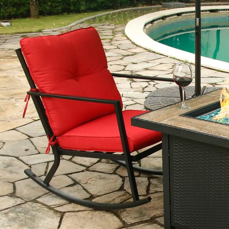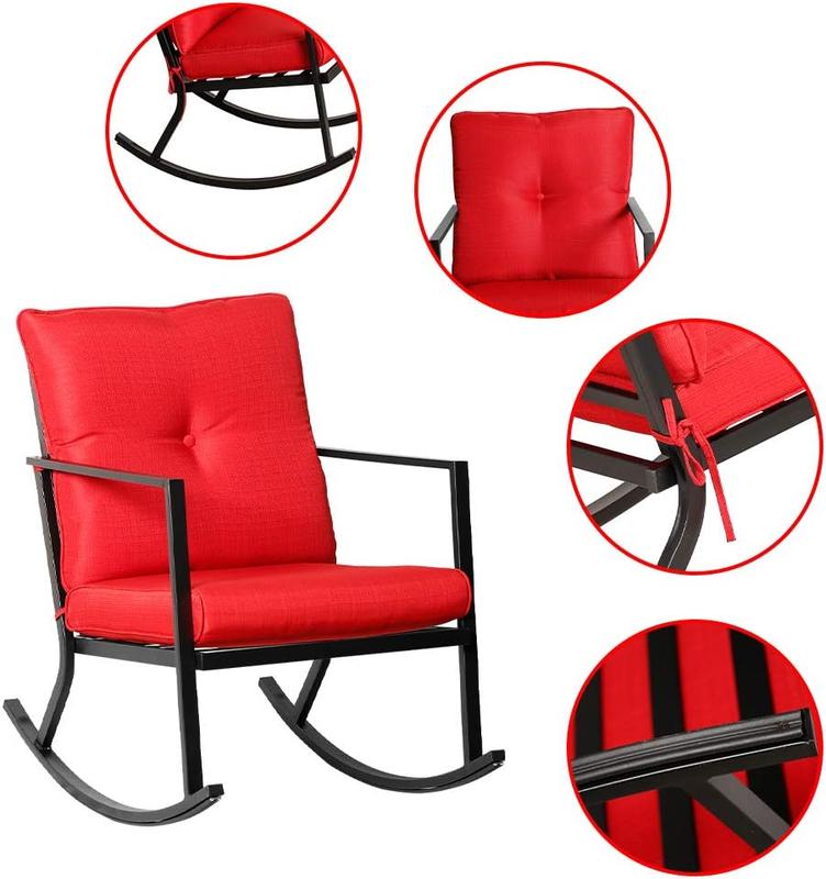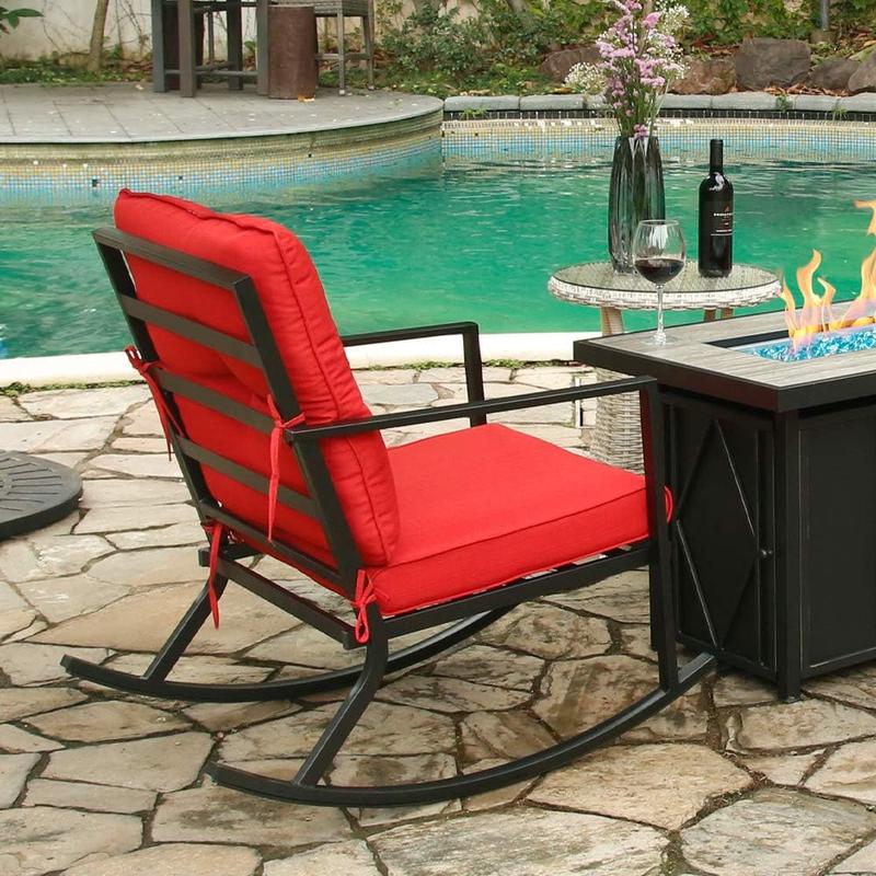 ·2-piece comfortable rocking chairs; includes 2 rocking chairs, red thick seat cushion and extra lumbar pillow for optimal sitting comfort; Ideal for garden, patio, or porch, simple elegant design suitable for fire pit or any-size space
