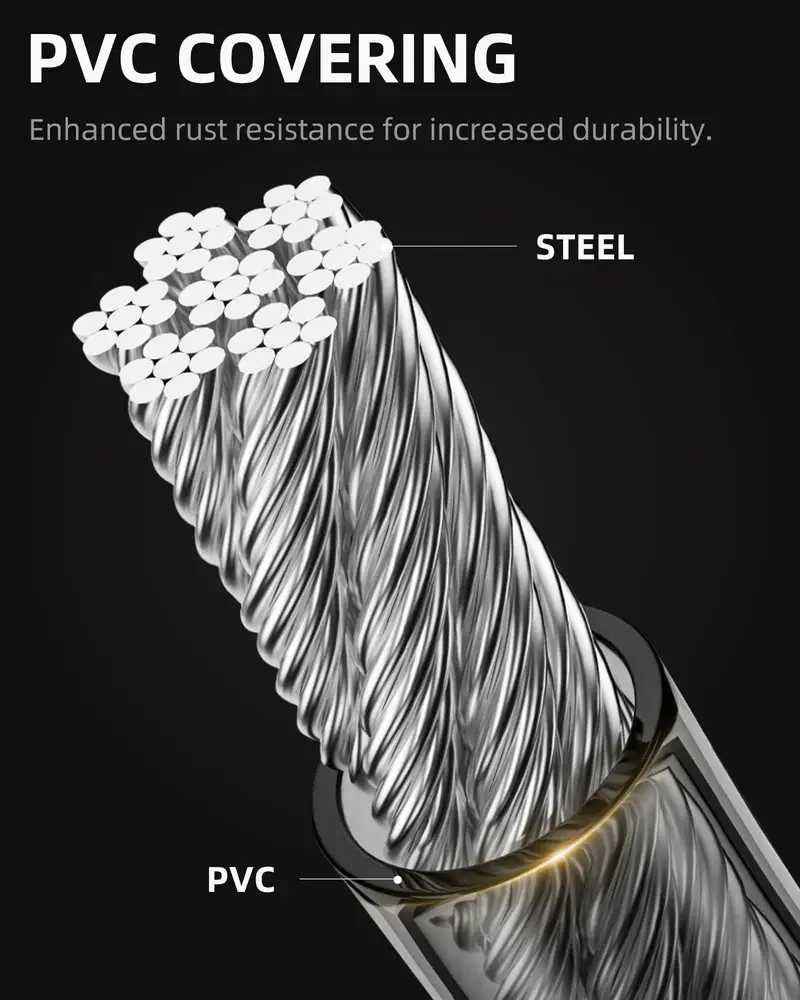 Cut-Resistant Steel Cable: Strong steel wire resists cutting, with a PVC coating for rust prevention and durability.