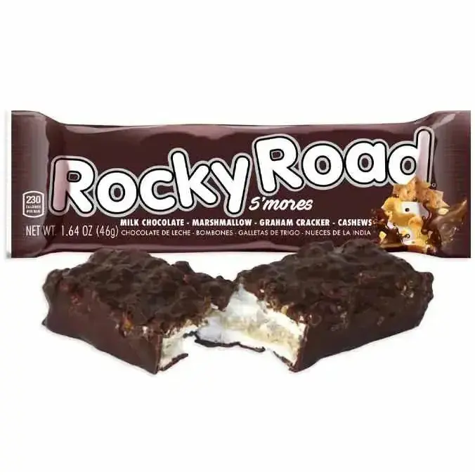 Indulge in the irresistible taste of a s’more without the mess and hassle of starting a fire with Rocky Road Smores candy bars. A delectable spin on the original Rocky Road candy bar that dates back to the 1950s, this campfire candy creation is crafted with a crunchy graham cracker center. Surround that sweet goodness with handmade fluffy marshmallows, top it with a layer of roasted cashew nuts, and drench the whole thing in rich milk chocolate — where were we? In a nutshell, these s'mores bars are divine. Grab yourself a 24-piece box of milk chocolate coated marshmallow heaven from Candy Warehouse, because once you try one, you’re going to want s’mores. Display box includes 24 Smores Rocky Road Candy Bars. Made in the USA.