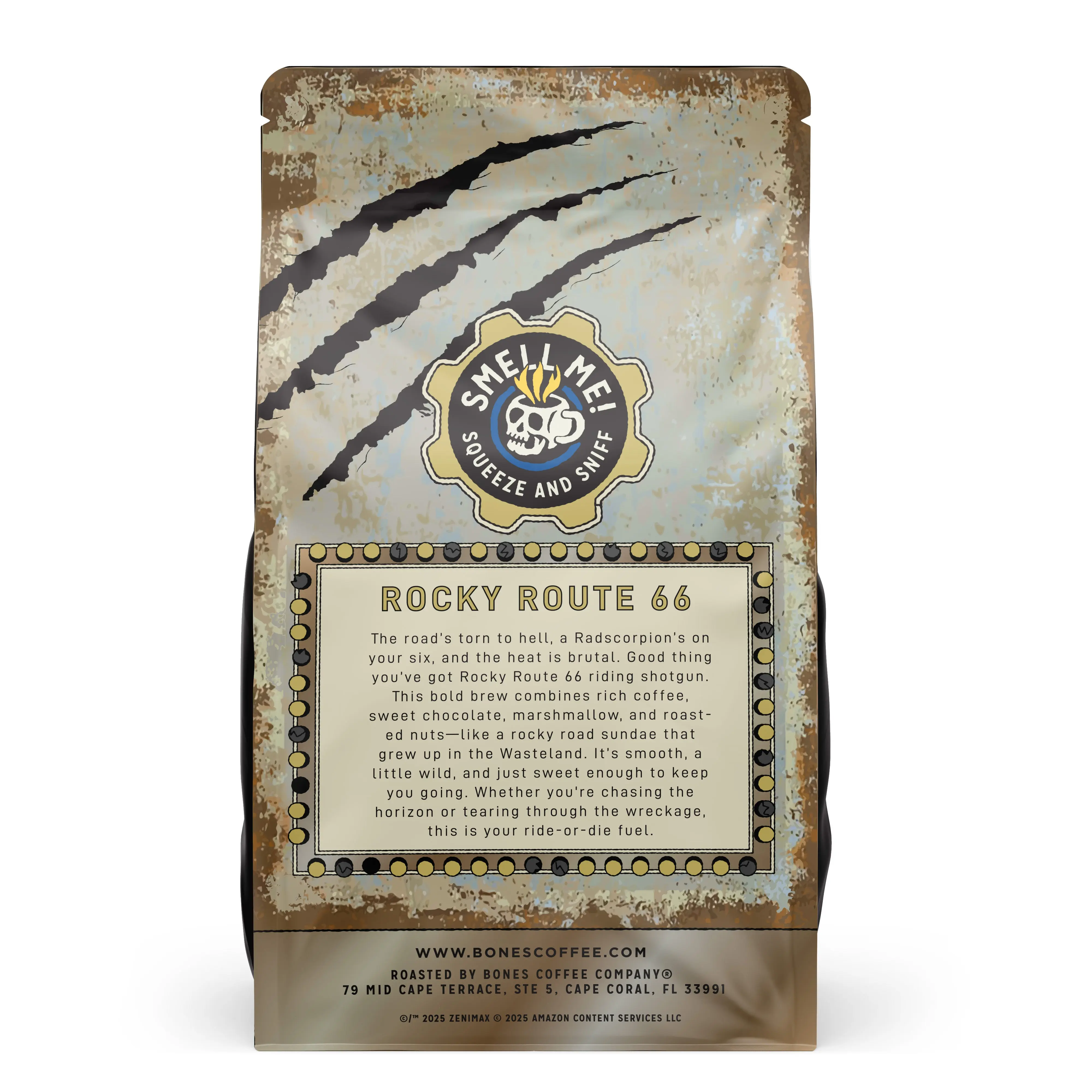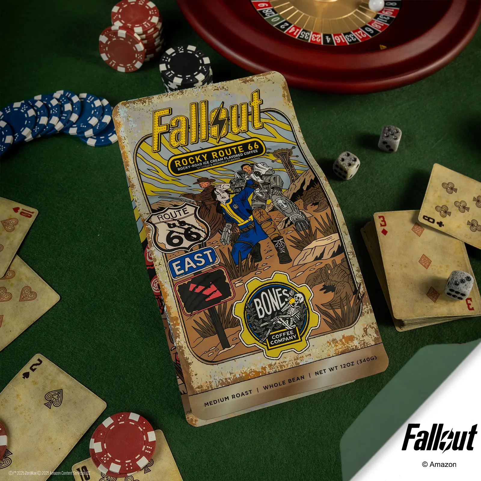 🎲 You hit the motherload with this Collector’s Box! Go all-in with 2 NEW coffee flavors!  🍫 Mojave Mocha doubles down with chocolatey goodness in your mug while 🍨 Rocky Route 66 hits with chocolate, marshmallow, and roasted nuts flavoring! 🤤☕️  Available Now in 12oz Whole Bean & Ground. #BonesCoffee #FlavoredCoffee #fallout #falloutseason2  ©️/™️ 2025 ZeniMax ©️ 2025 Amazon Content Services LLC