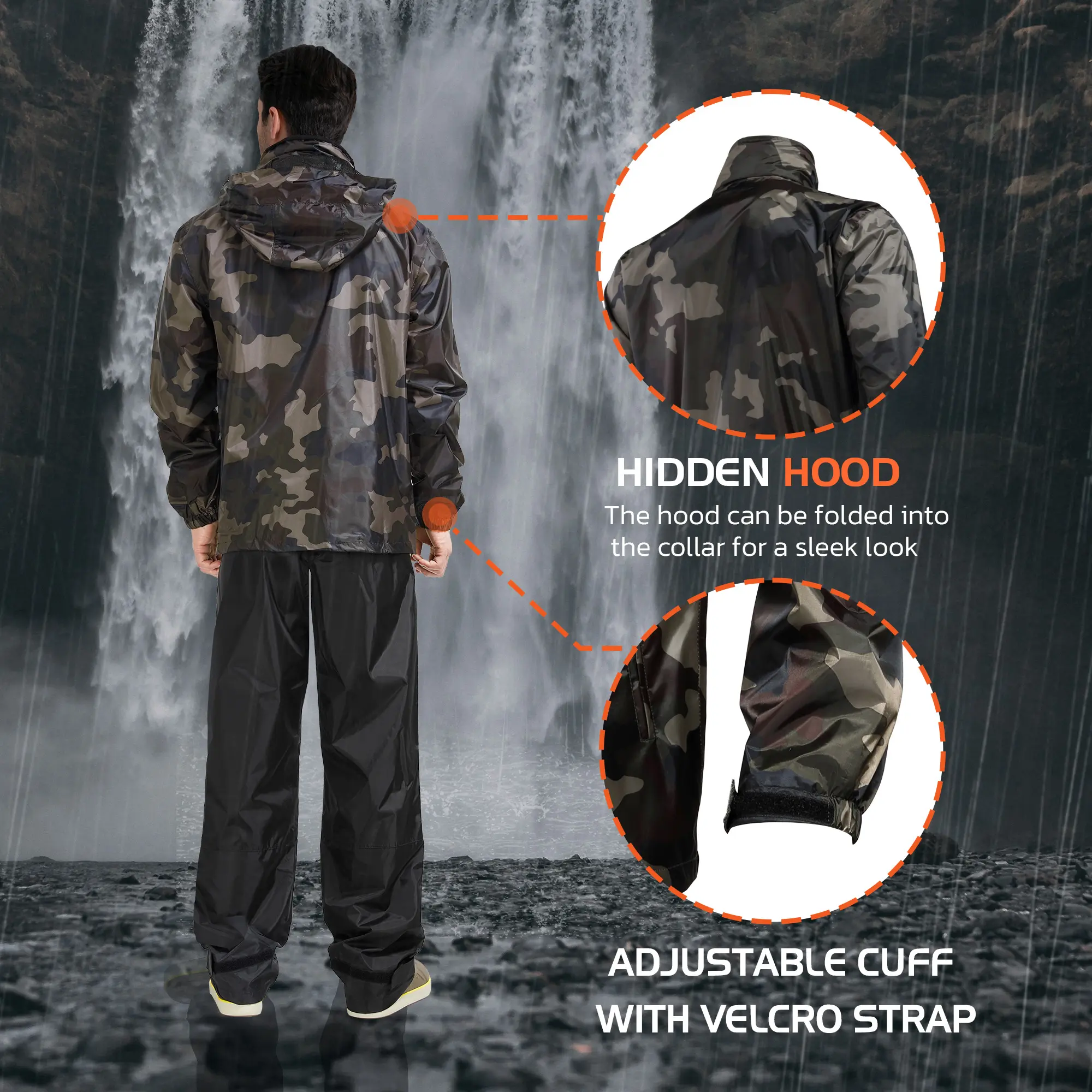 ·Features: Adjustable hood, multi-pocket utility, elastic waistband, secure zippered pockets, and adjustable pant legs.