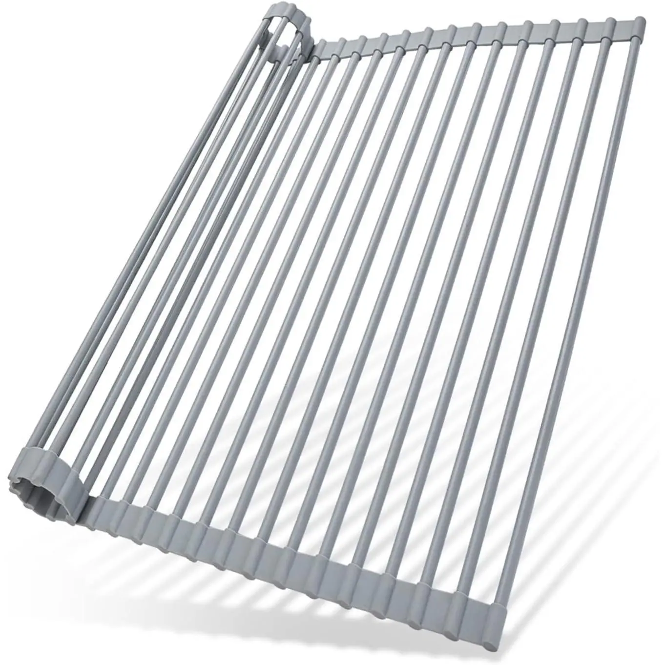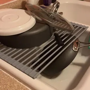 This multifunctional silicone wrap foldable dish drainer is perfect for your kitchen counter. It measures 17.6"W x 15.4"L, offering ample space for drying dishes. The roll-up design ensures easy storage when not in use. Ideal for over-the-sink placement, it keeps your kitchen organized.