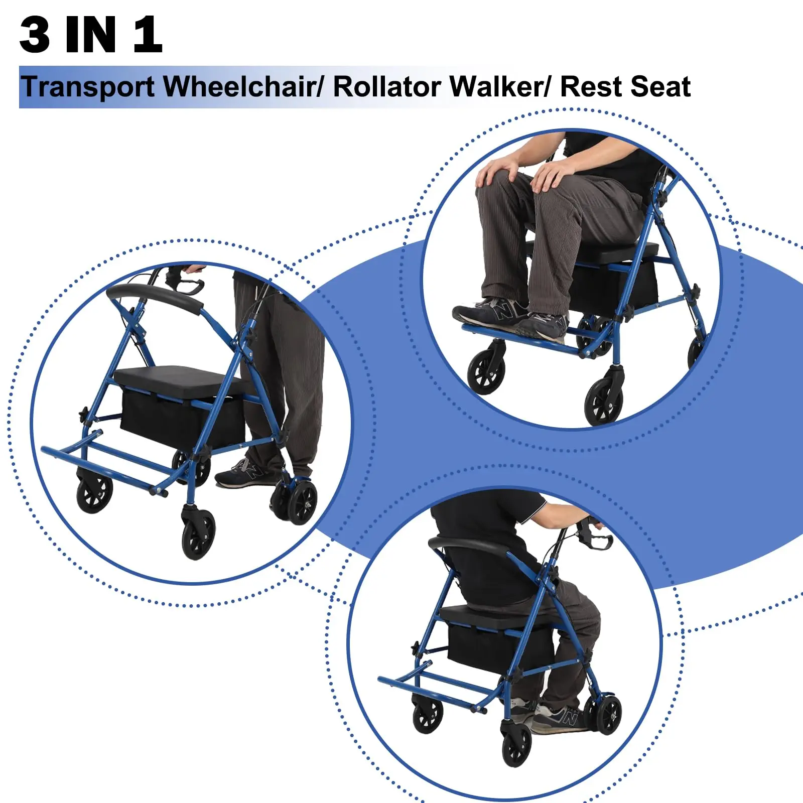 3-in-1 Multifunctional Design: walker, rest seat or wheelchair? With this model, you don't have to choose! It's an innovative and practical solution that you can use as a walker, rest seat, or transport chair by attaching the footrest and flipping the backrest. Don't let limited mobility hold you back, take the first step on a new journey today!