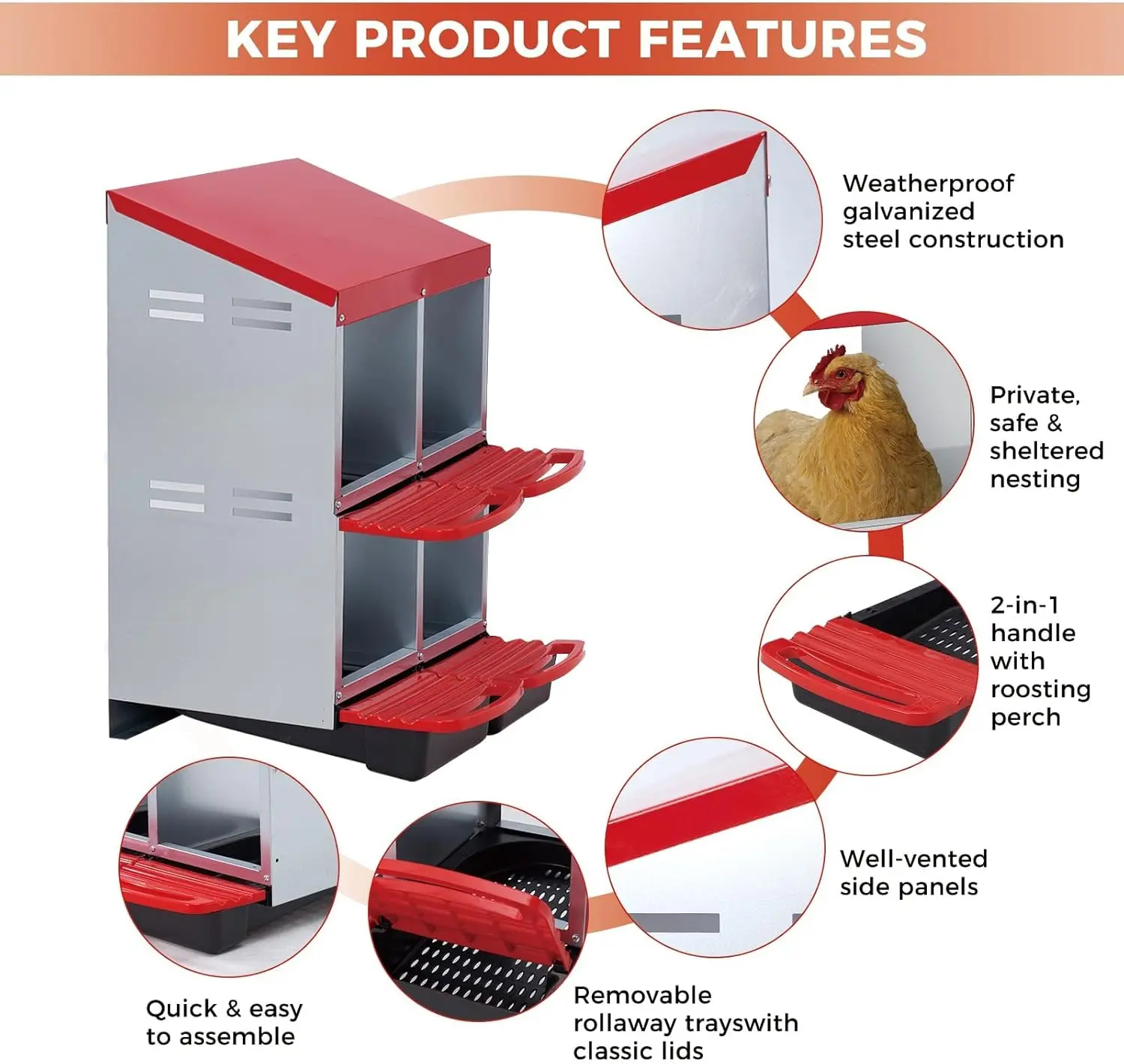 ·Robust & Weather-Resistant Construction: Constructed from galvanized steel and high-quality plastic, these chicken nesting boxes are engineered for long-term outdoor use. The robust metal structure provides reliable durability across all seasons, ensuring a stable environment for your poultry in any backyard or farm setting.