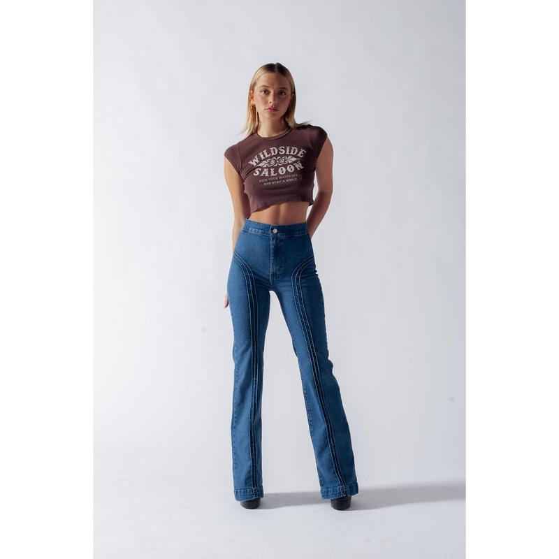 DETAILS 34" Inseam 22" Flare High Waisted Saddleback Caballo stitching Piping Details Premium Quality Cone Mills Fabric Comfort Stretch Denim 98% Cotton, 2% Elastane