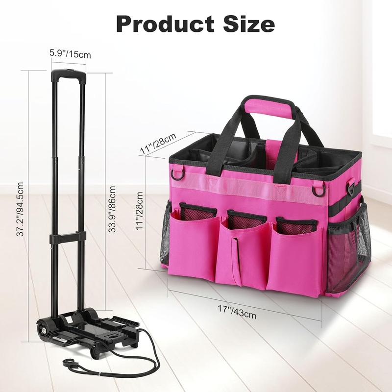 ·【Portable Detachable Trolley】 Our cleaning caddy bag comes with a trolley to help you solve the problem of carrying too much weight while walking. The cart is detachable and can be adjusted to different heights to suit more needs, up to 37.2"/94.5cm, besides, it can be folded to save space when not in use.