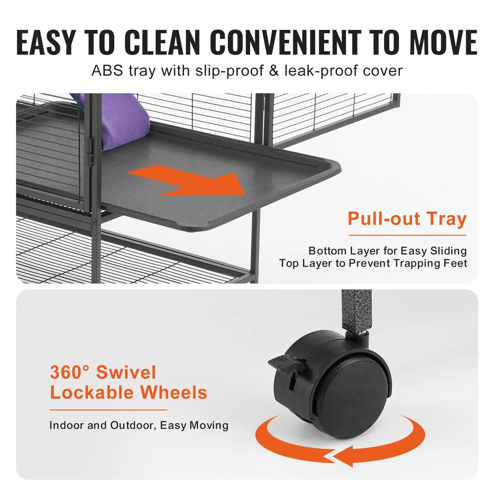 • Easy to Clean: The removable platforms and grids make cleaning easy. The ABS-coated metal bottom tray fits tightly with the metal mesh to prevent urine leakage and foot injuries, providing a safe environment. The pull-out design and openable front door facilitate quick and convenient cleaning.