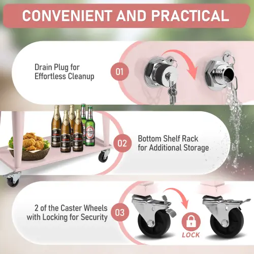 ·【STURDY & REMOVABLE】4 multi-directional wheels is much convenient to move the rolling ice cart to any place. 2 of them is lockable to keep the cooler in place. Solid metal handles help you to push or pull the cooler easily