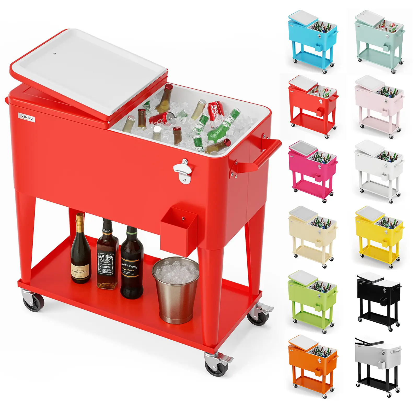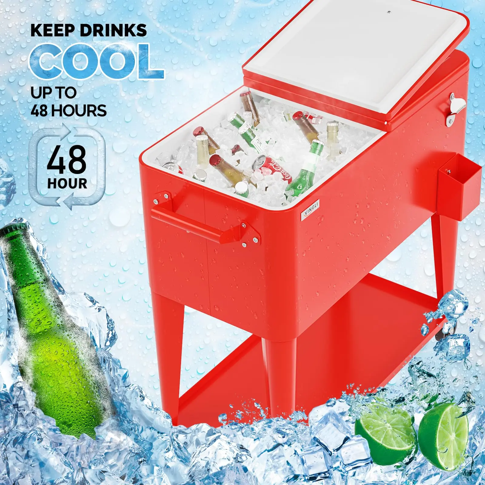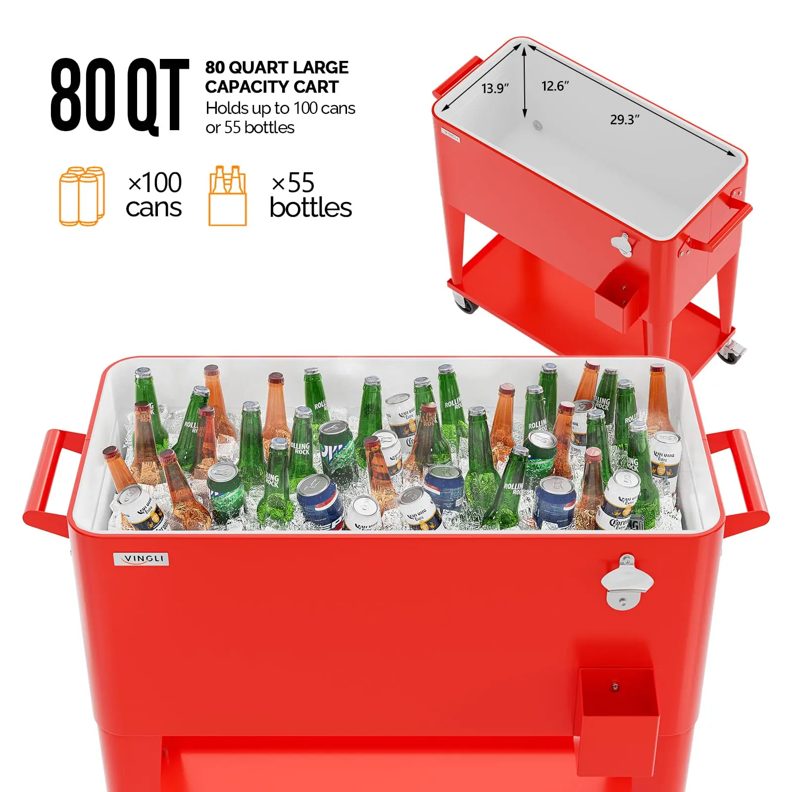 VINGLI 80 QUART COOLER CART: Holds up to 80 quarts (20 gallons) 96 aluminum can, It Will Be a Perfect Tool to Cool Your Drinks, Such As Beer, Beverage and Juicy. Keep cool for 48hrs and keep warm for 8hrs. Convenient rolling cooler is perfect for any outdoor and indoor occasion like a barbeque or backyard party.