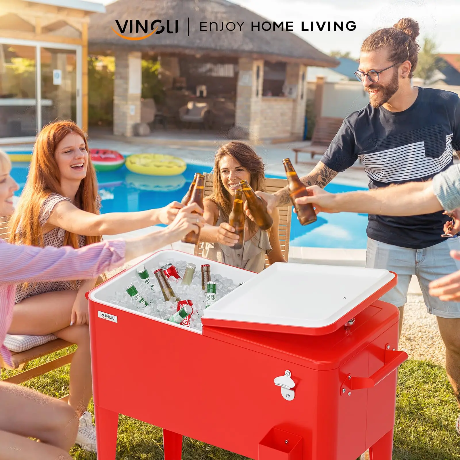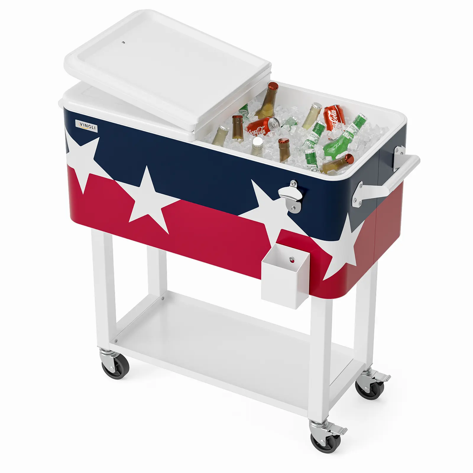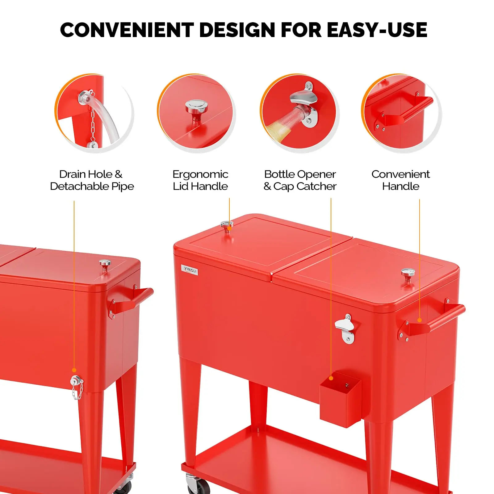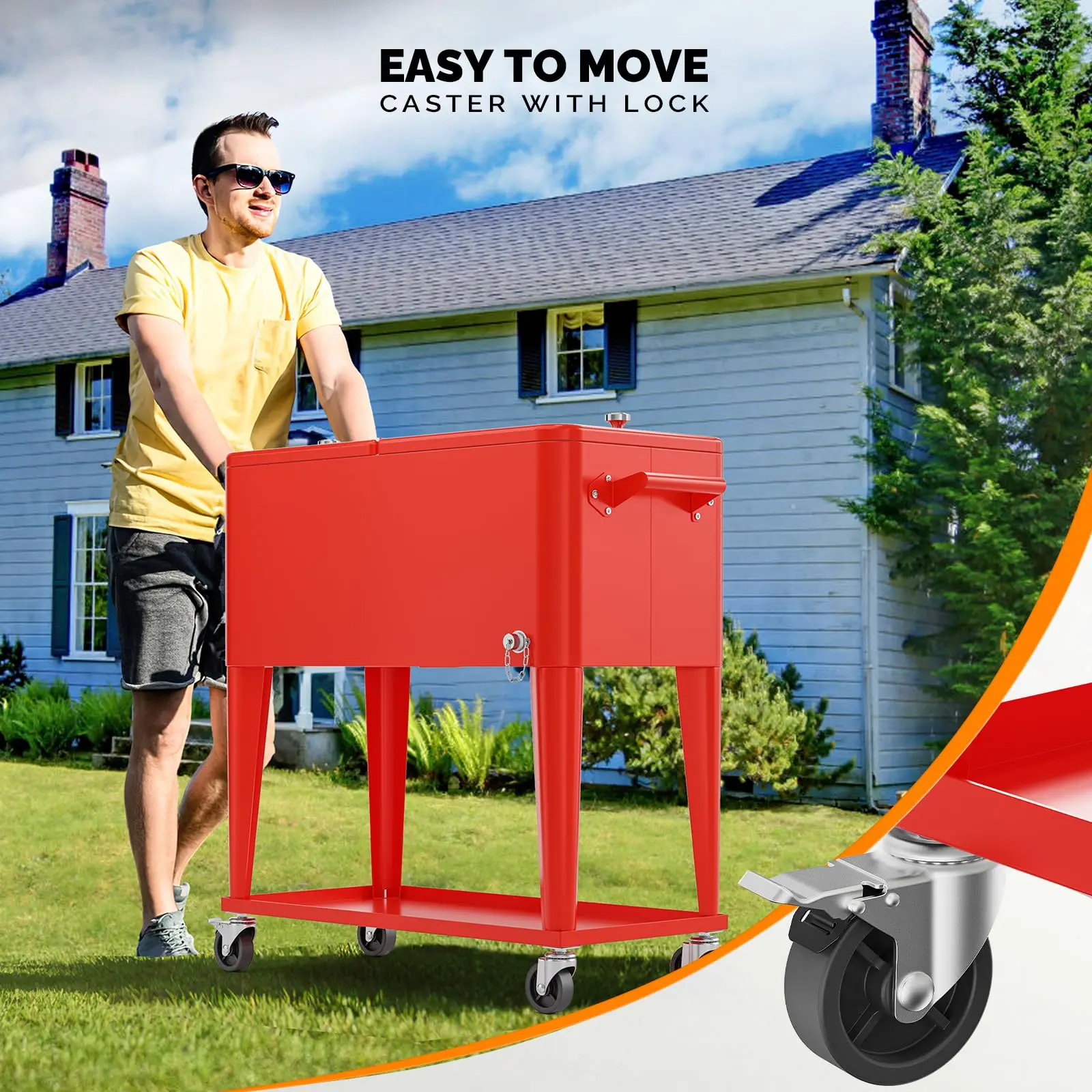 VINGLI 80 QUART COOLER CART: Holds up to 80 quarts (20 gallons) 96 aluminum can, It Will Be a Perfect Tool to Cool Your Drinks, Such As Beer, Beverage and Juicy. Keep cool for 48hrs and keep warm for 8hrs. Convenient rolling cooler is perfect for any outdoor and indoor occasion like a barbeque or backyard party.