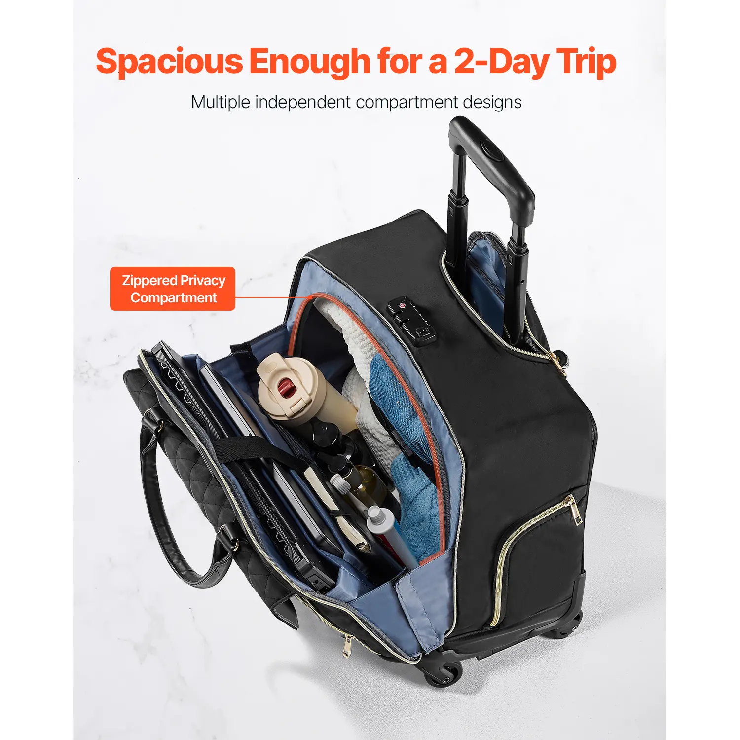 • Organized Storage, Easy Access: Designed with one spacious main compartment, this rolling briefcase fits laptops up to 17.3 in along with important documents. An additional privacy compartment holds clothing and toiletries, while front and side pockets optimize storage for stationery, water bottles, and other essentials