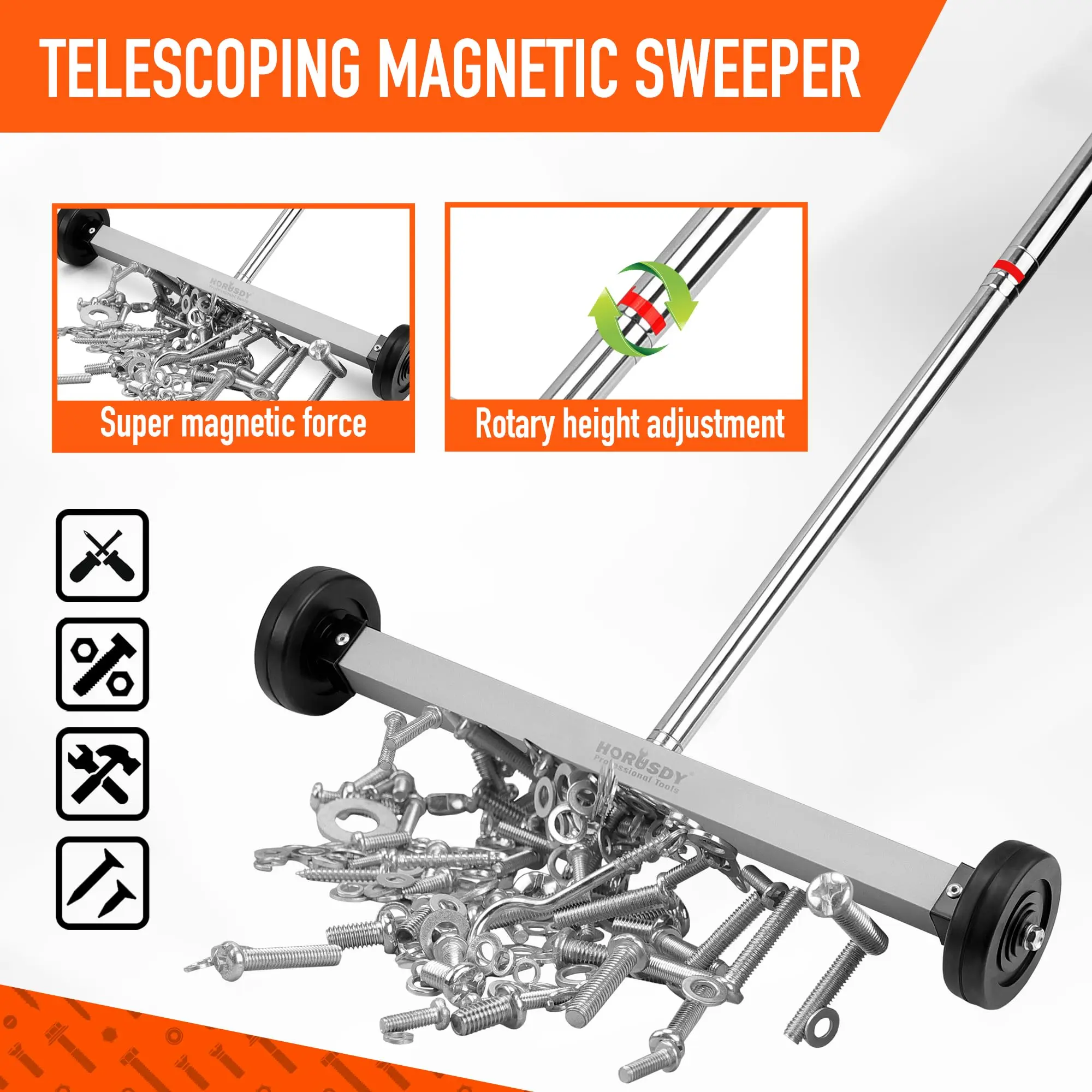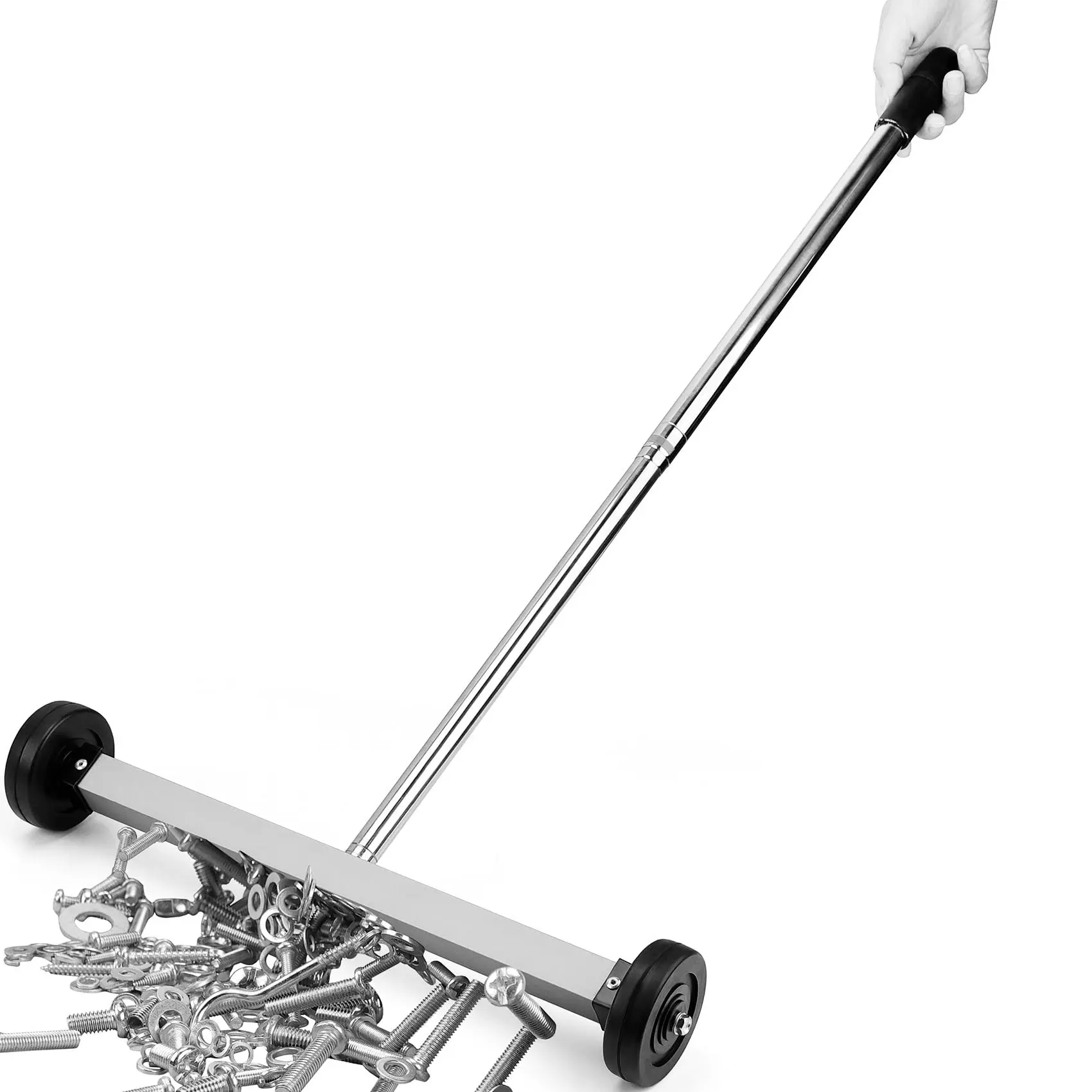 ·17-Inch Rolling magnetic sweeper aims to retrieve nails, screws, and all black metal objects from the floor Maintain a load capacity of up to 8.8 pounds, protecting you from debris and sharp metals. Use this handle magnetic sweeper to keep your construction site clean and tidy.