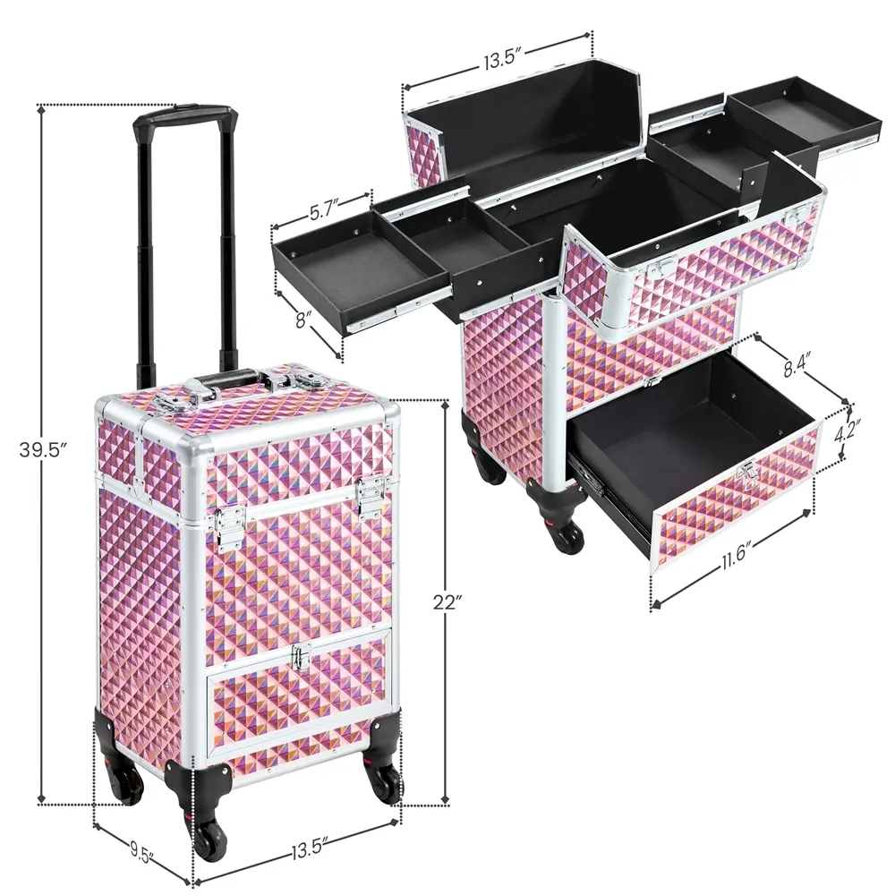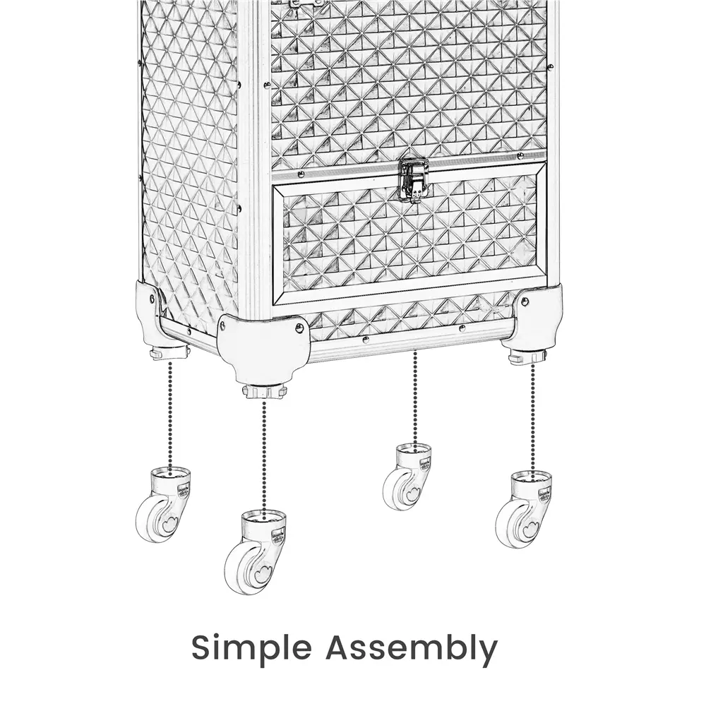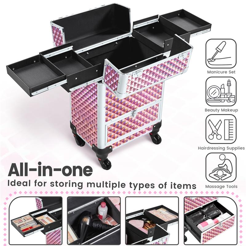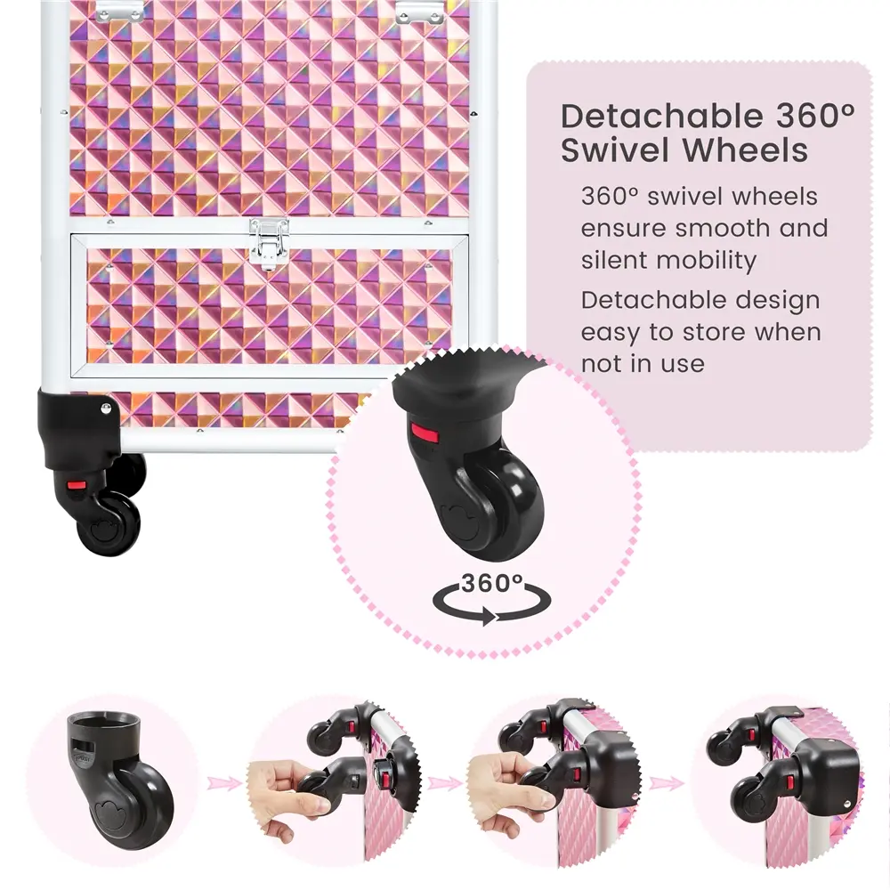 This rolling makeup case is specifically designed to keep your cosmetics and makeup tools neat, organized, easily accessible, and, most importantly, effortless carrying. You can enjoy an incredibly smooth operation with four slide-out trays with aluminum sliding tracks. The upper section has a large storage compartment, ideal for storing bottles and beauty devices. The bottom drawer is designed to keep your often-used items right at hand and easy to fetch. This rolling cosmetic organizer comes with detachable all-directional rolling wheels, making it convenient to move around. Whether you're getting ready in your bedroom or need to take your makeup on the go, this organizer has got you covered.