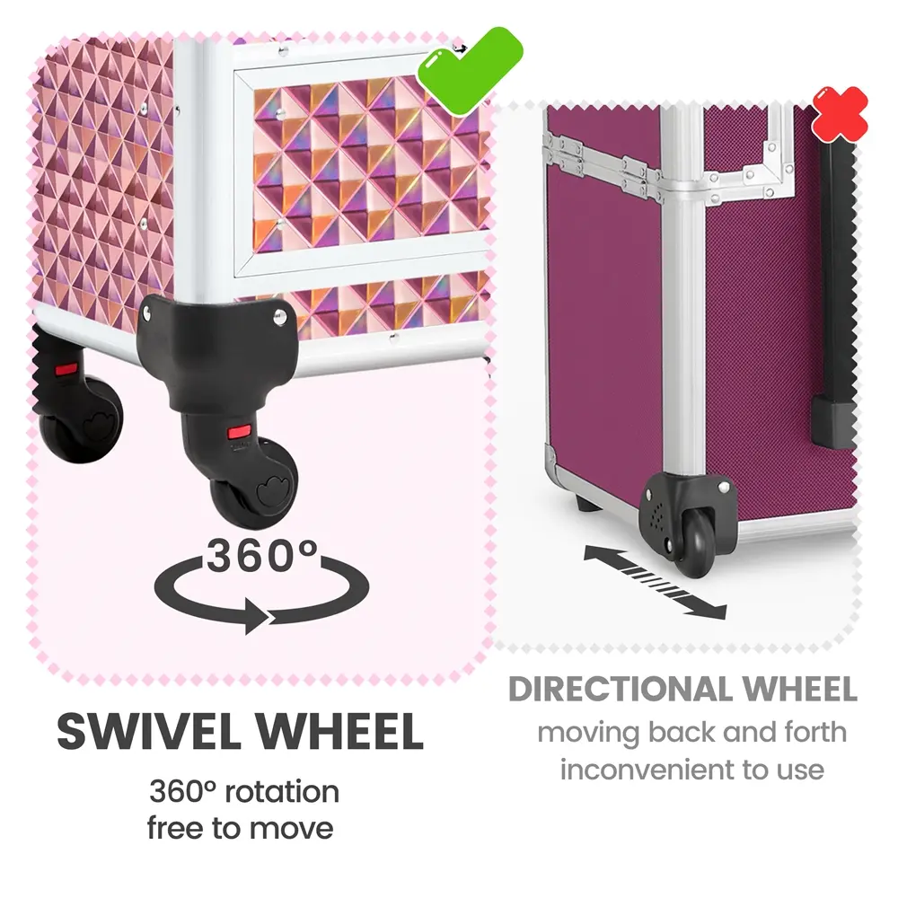 5. 【Smooth, Steady, Silent】: With the 360-degree wheels, this cosmetic train case gives you a seamless, stable, and noiseless roll in any direction. The 39.5″ long telescopic handle conveniently locks at the ideal height for effortless pulling. Hexagonal-shaped aluminum pulling rods ensure a steadier and smoother operation