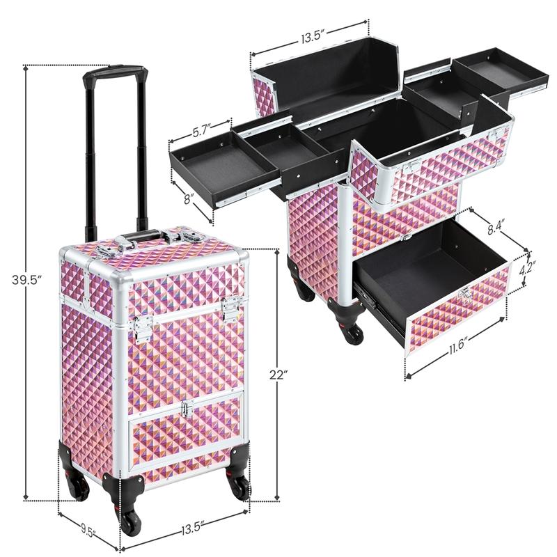 6. 【3-section Cosmetics Organizer】: This cute rolling makeup train case features 3 storage sections – 4 small slide-out trays keep small items organized; a middle roomy compartment holds large bottles and small beauty devices; the bottom drawer provides a handy storage solution for all often-used items