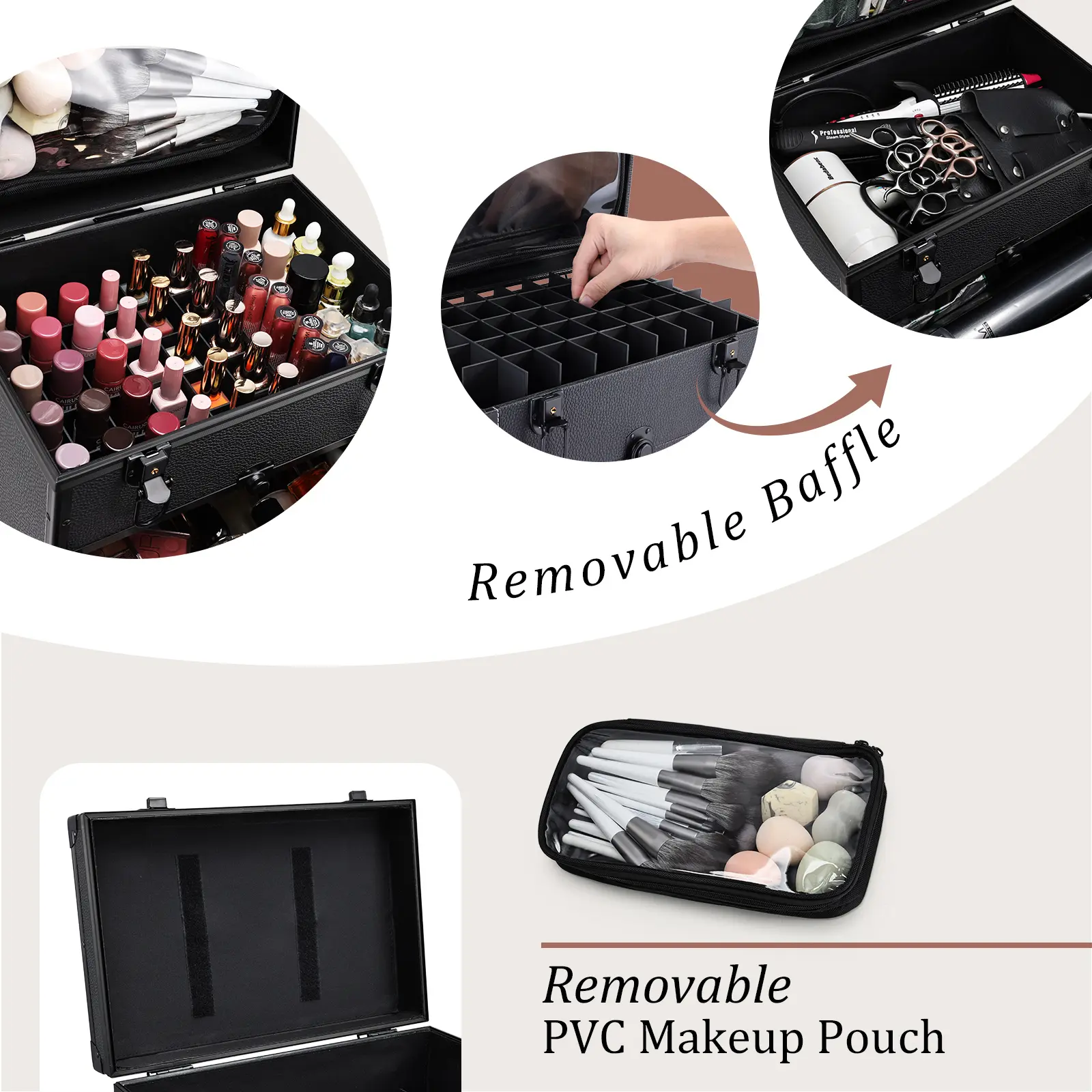 The top layer features a large removable divider compartment which can keeps nail polish bottles upright or can be taken out to create space for larger beauty tools. It can allow you to customize the layout for items of different sizes, keeping everything organized while preventing shaking and damage during transport. A zippered makeup pouch attached to the top lid provides extra storage for brushes and small accessories.