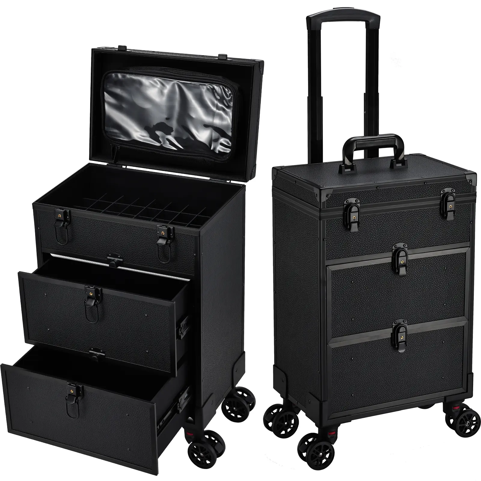 Designed with premium black vegan leather and a reinforced Grade-A aluminum frame, this makeup train case delivers exceptional durability and protection for professional use. The 360° swivel wheels roll smoothly and quietly, with lockable and detachable features for stability and convenience. The telescopic pull rod extends up to 38 inches for a comfortable working height. Each layer is lockable with a key to keep your tools secure, making it the perfect travel-ready solution for organized beauty storage anytime, anywhere.