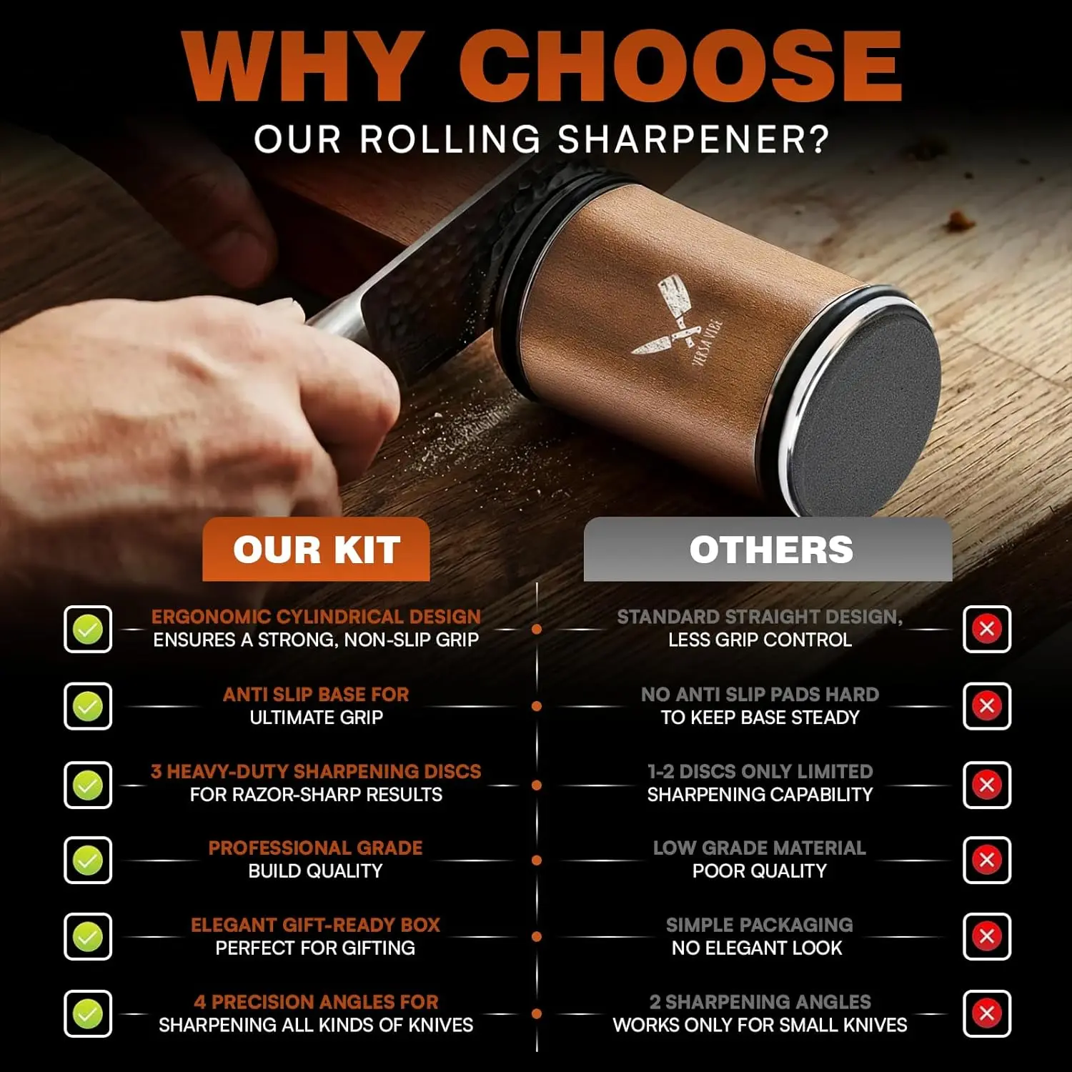 Upgraded Cylindrical Rolling Sharpener _ Designed for precision, durability, and style. This innovative sharpener includes grit, ceramic, and polishing discs, giving you everything you need to restore dull and achieve a razor- finish. With 4 adjustable angles (15°, 18°, 20°, 22°), it’s suitable for types of , from chef’s to cleavers.