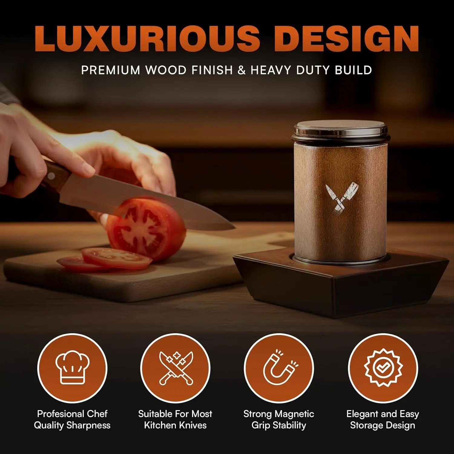 Finish & Heavy Duty Build _Crafted with a luxurious exterior and reinforced metal base, this sharpener combines modern elegance with durability.Engineered for precision and crafted to complement any kitchen.