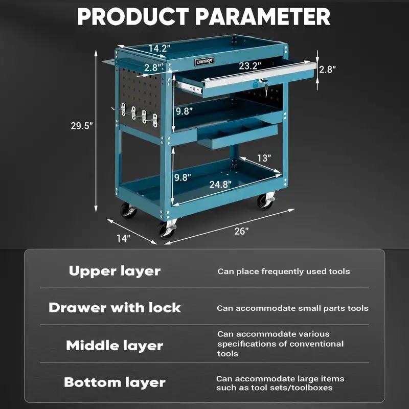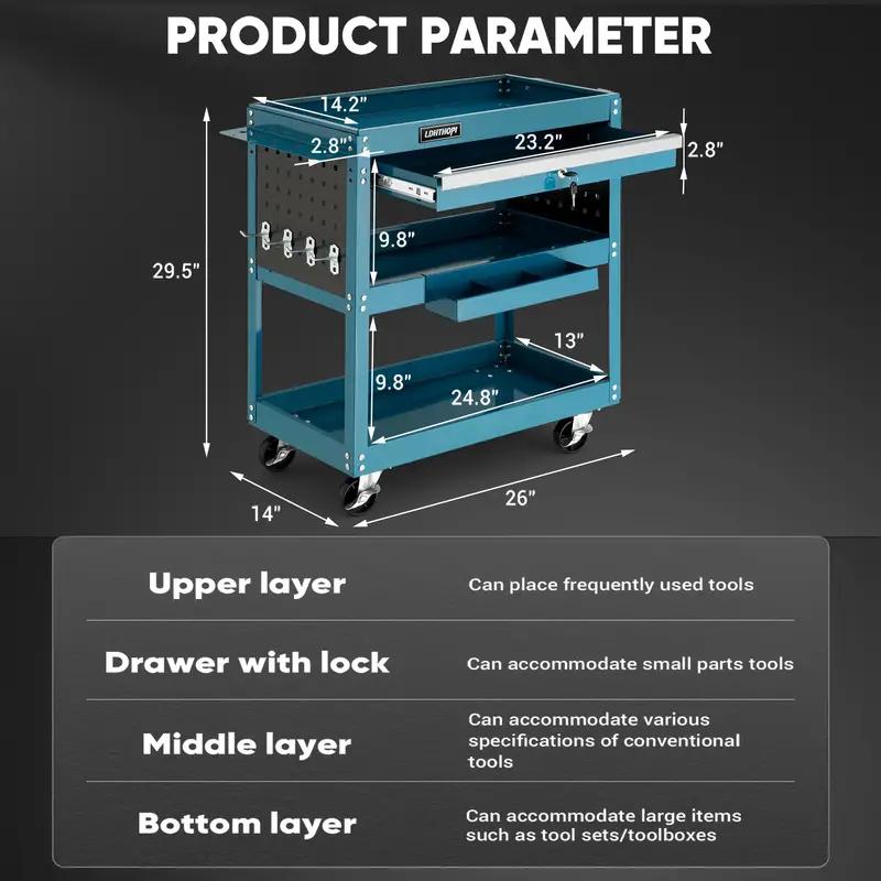 【Multilevel Storage Space】Rolling tool cart is designed to include three trays and a sliding drawer for easy carrying of small parts and storage of screwdrivers, pliers and other repair tools. The drawers are equipped with locks to keep your stored items secure.