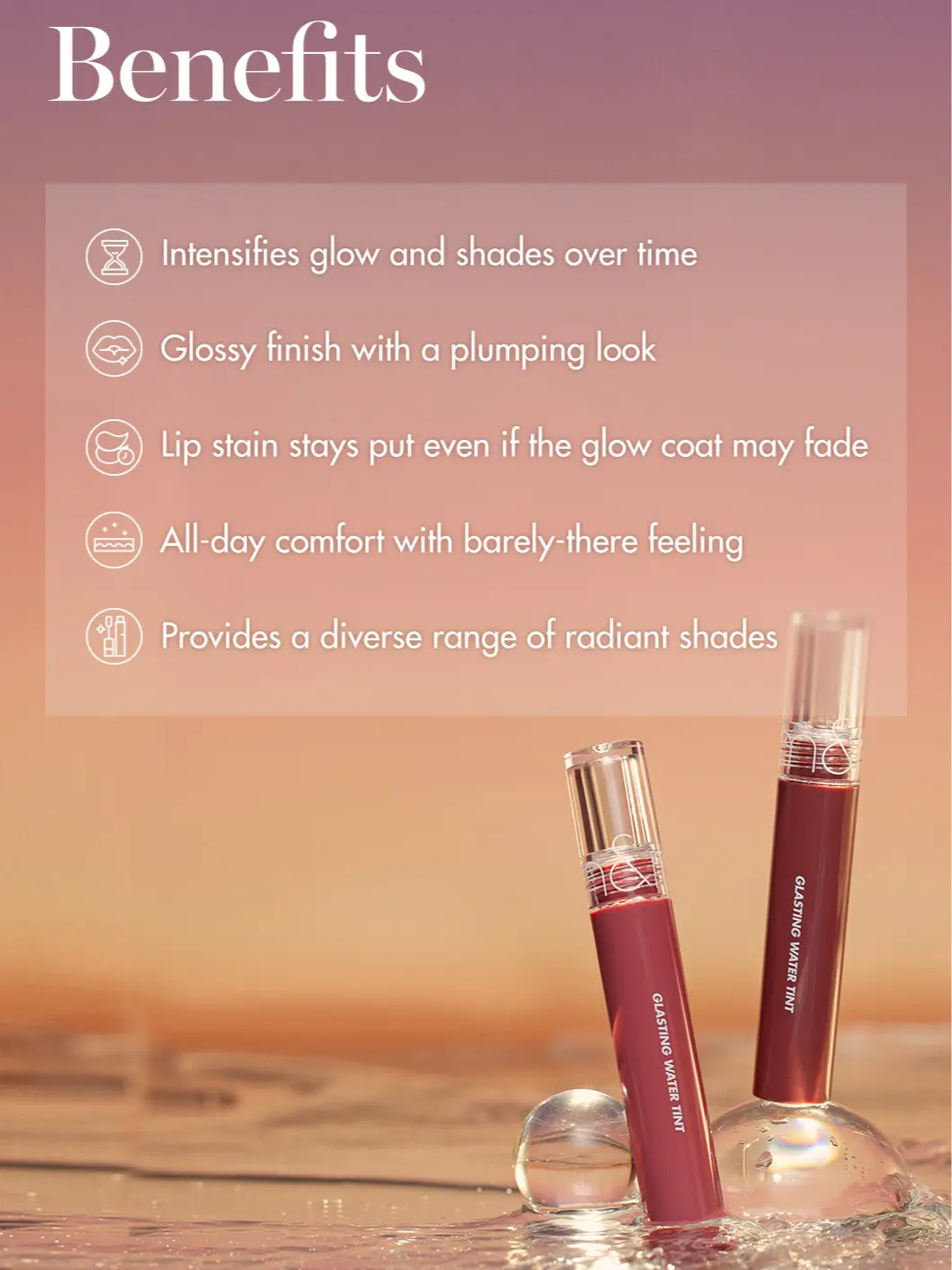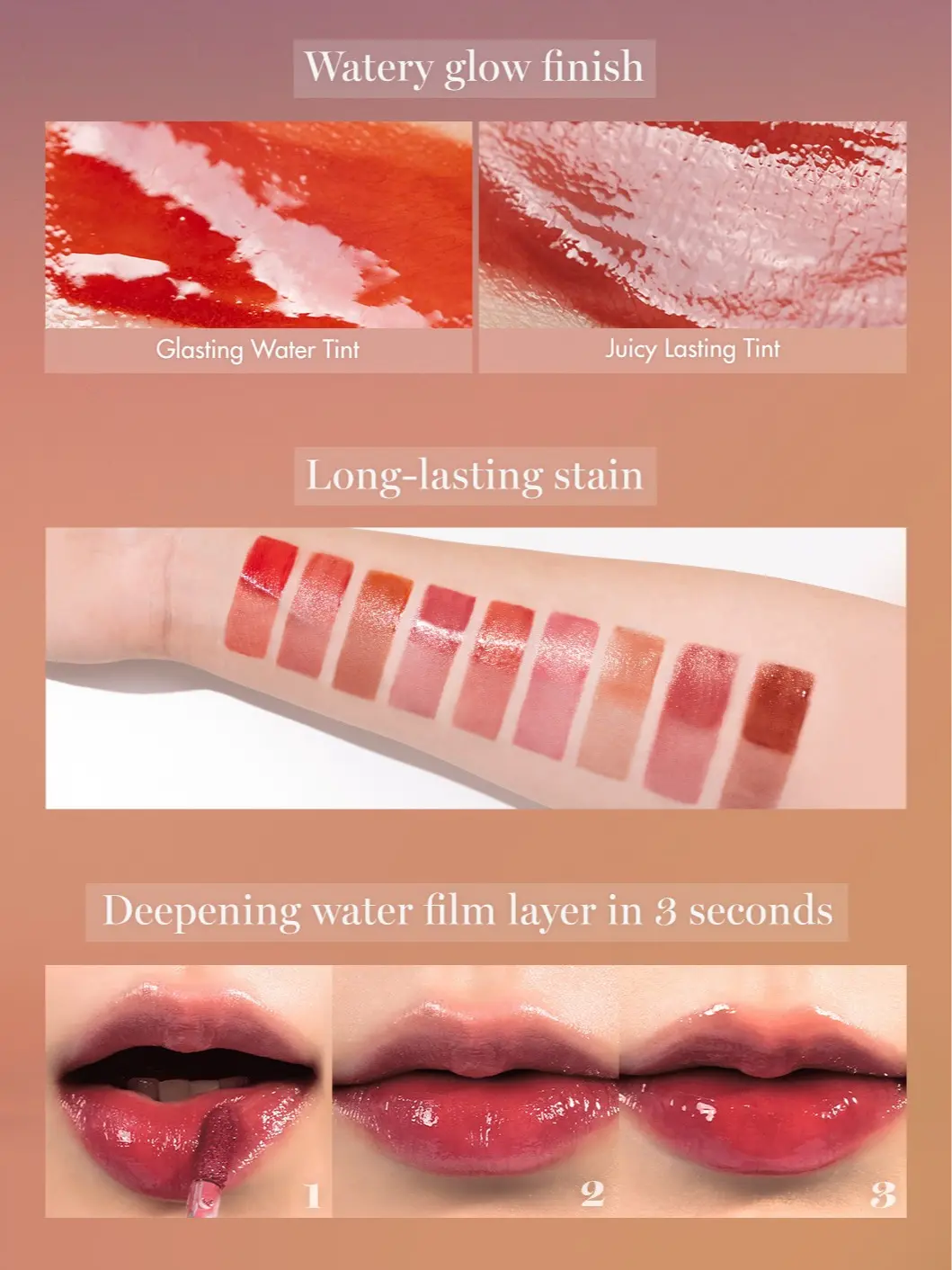 A cherry-like tint that gives you a rich& glossy layer in 3 secs! Non-sticky& glass-coated layer and color layer, these two separate layers allow to stay the colors longer on your lips.