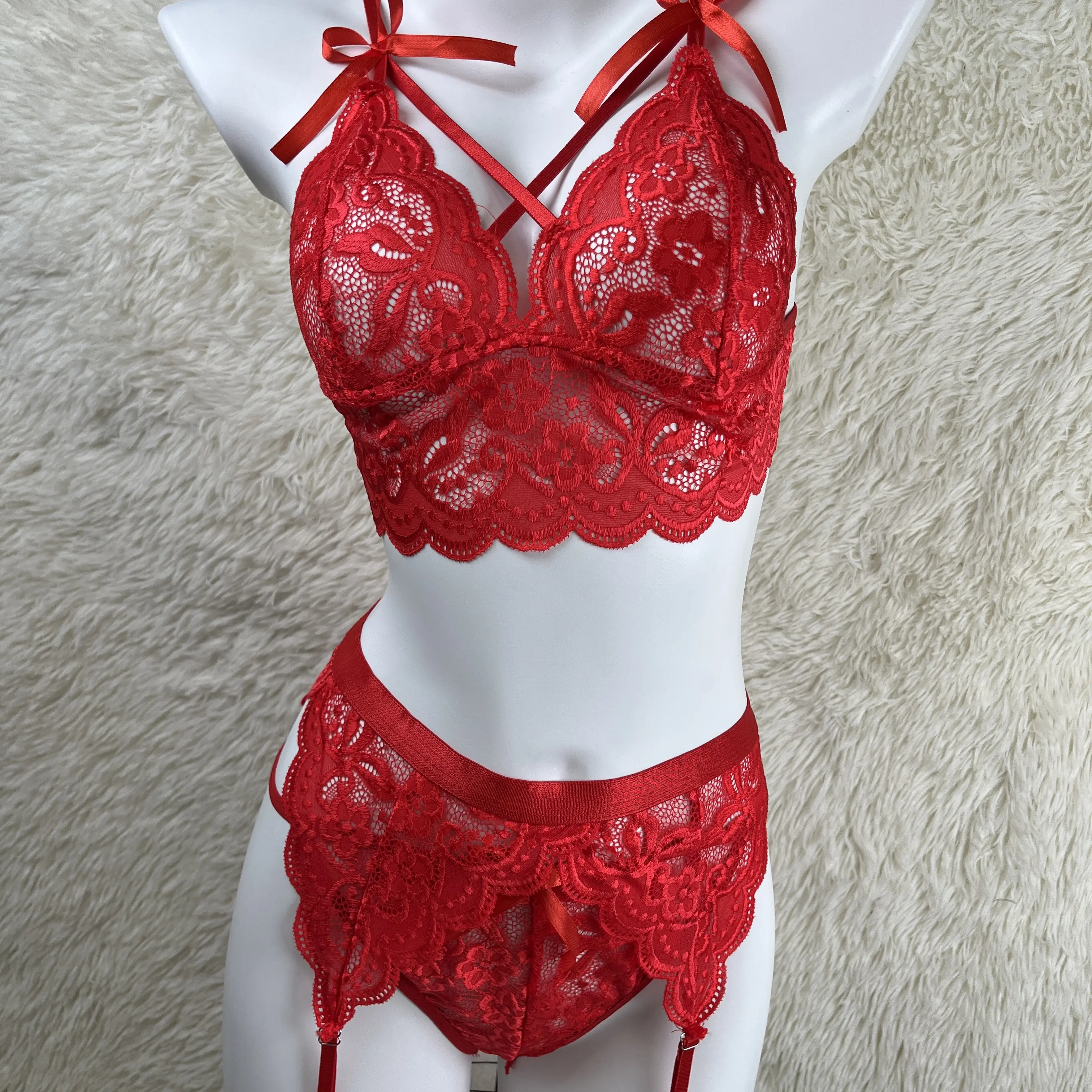 • 3-Piece Design: Includes a balconette bra with crisscross straps, a high-waist panty with garter belt loops, and detachable suspender straps for a customizable fit.