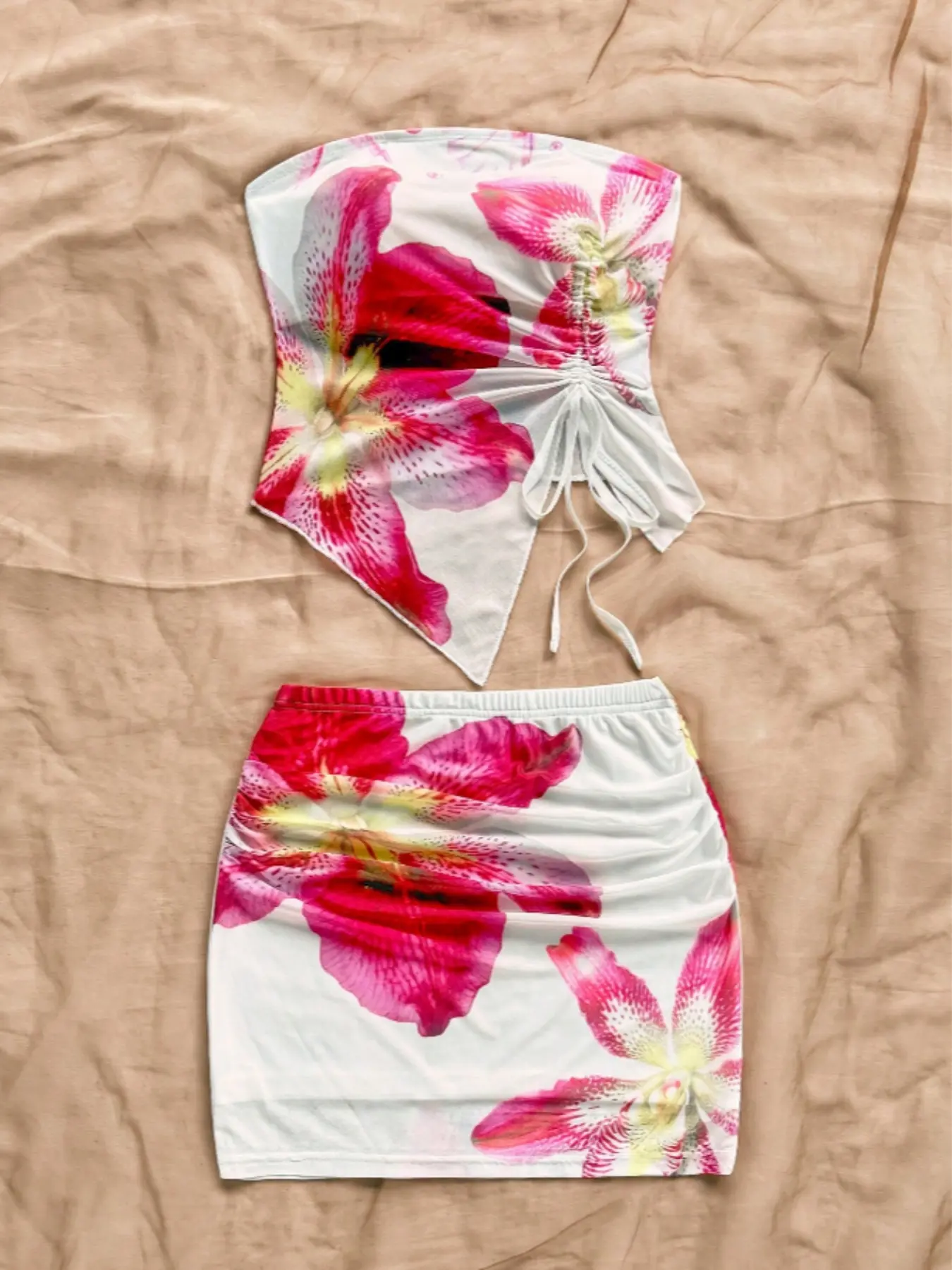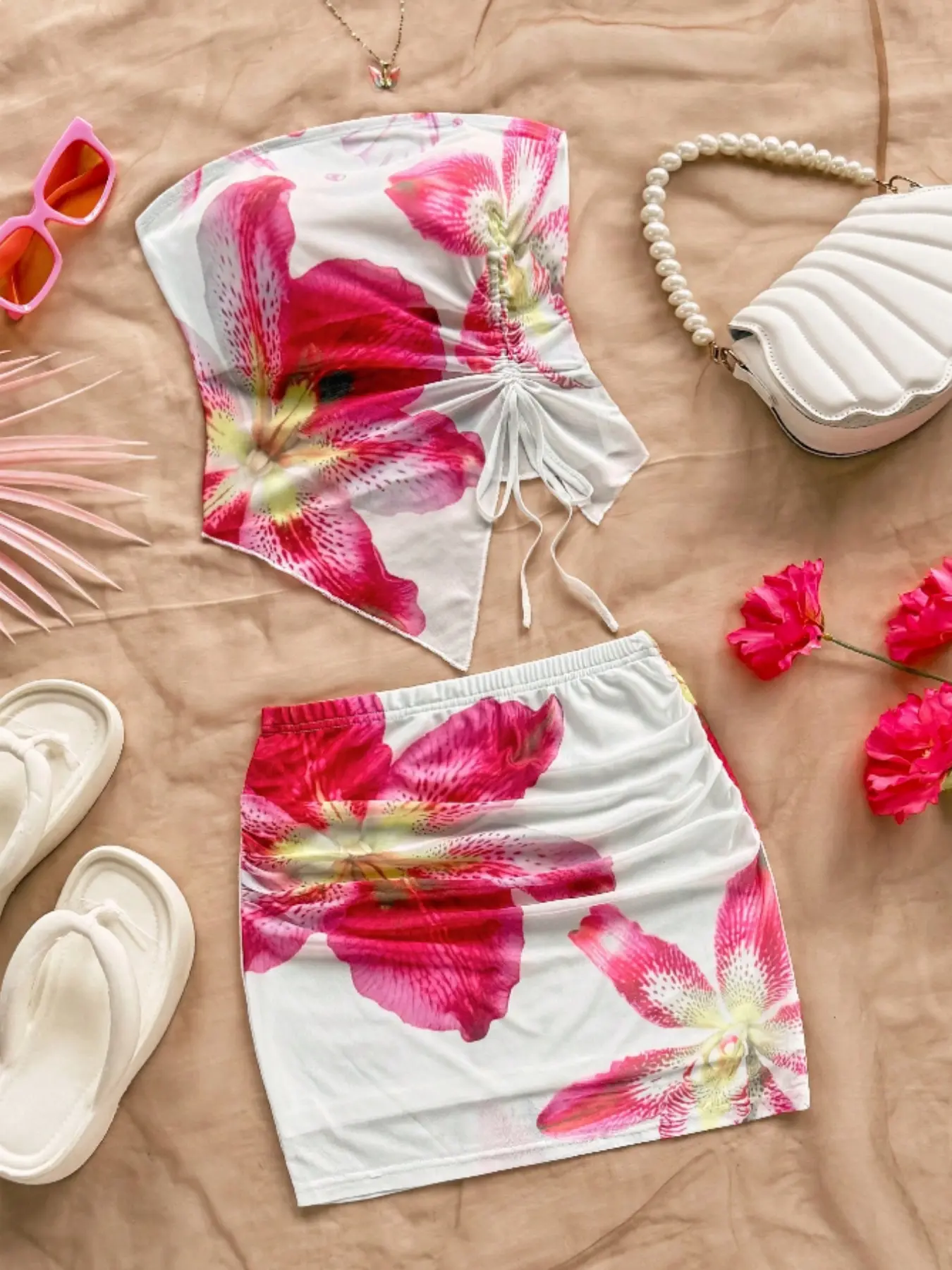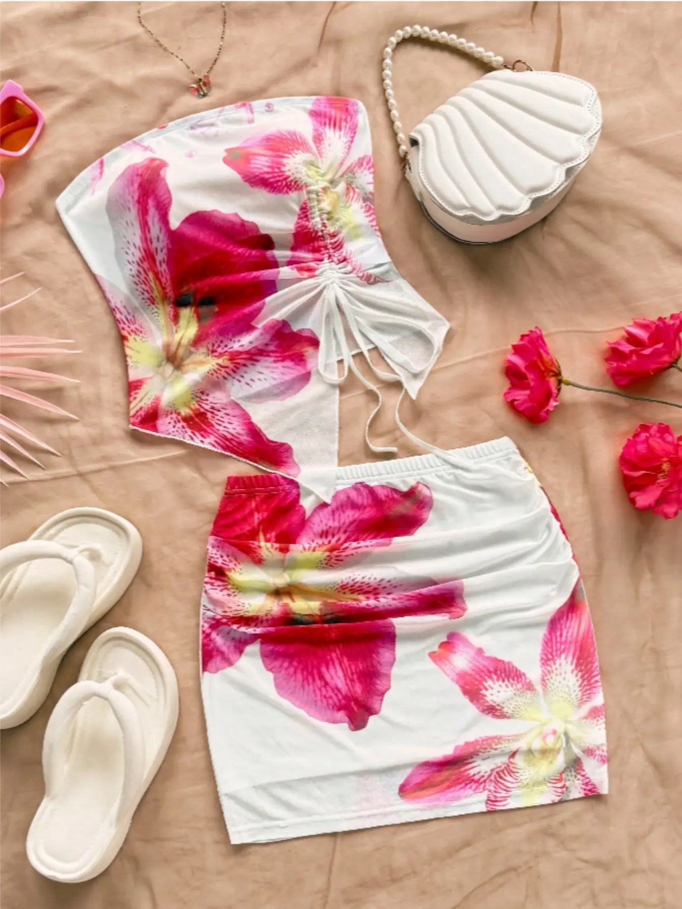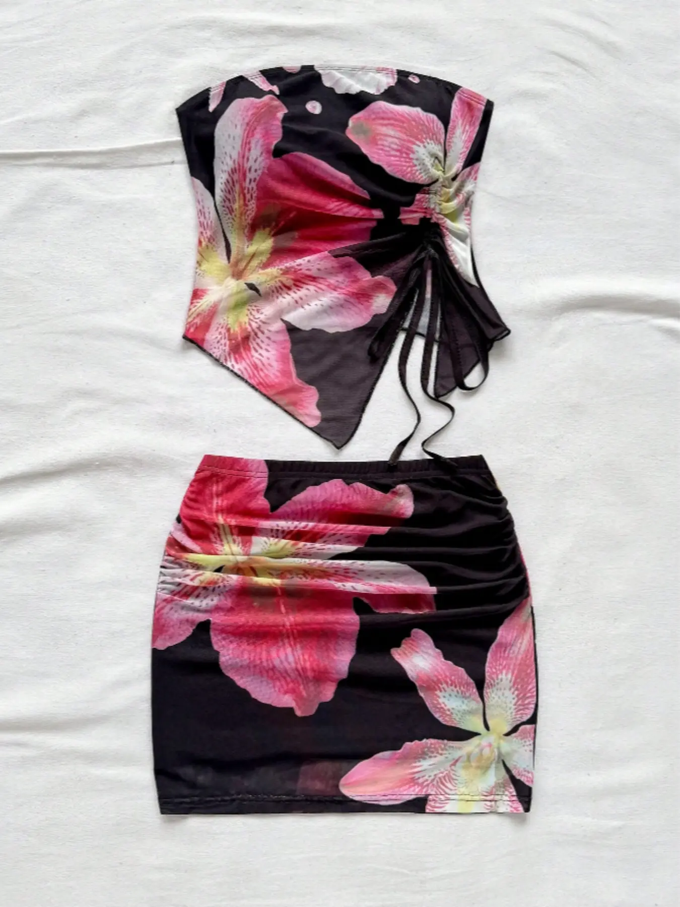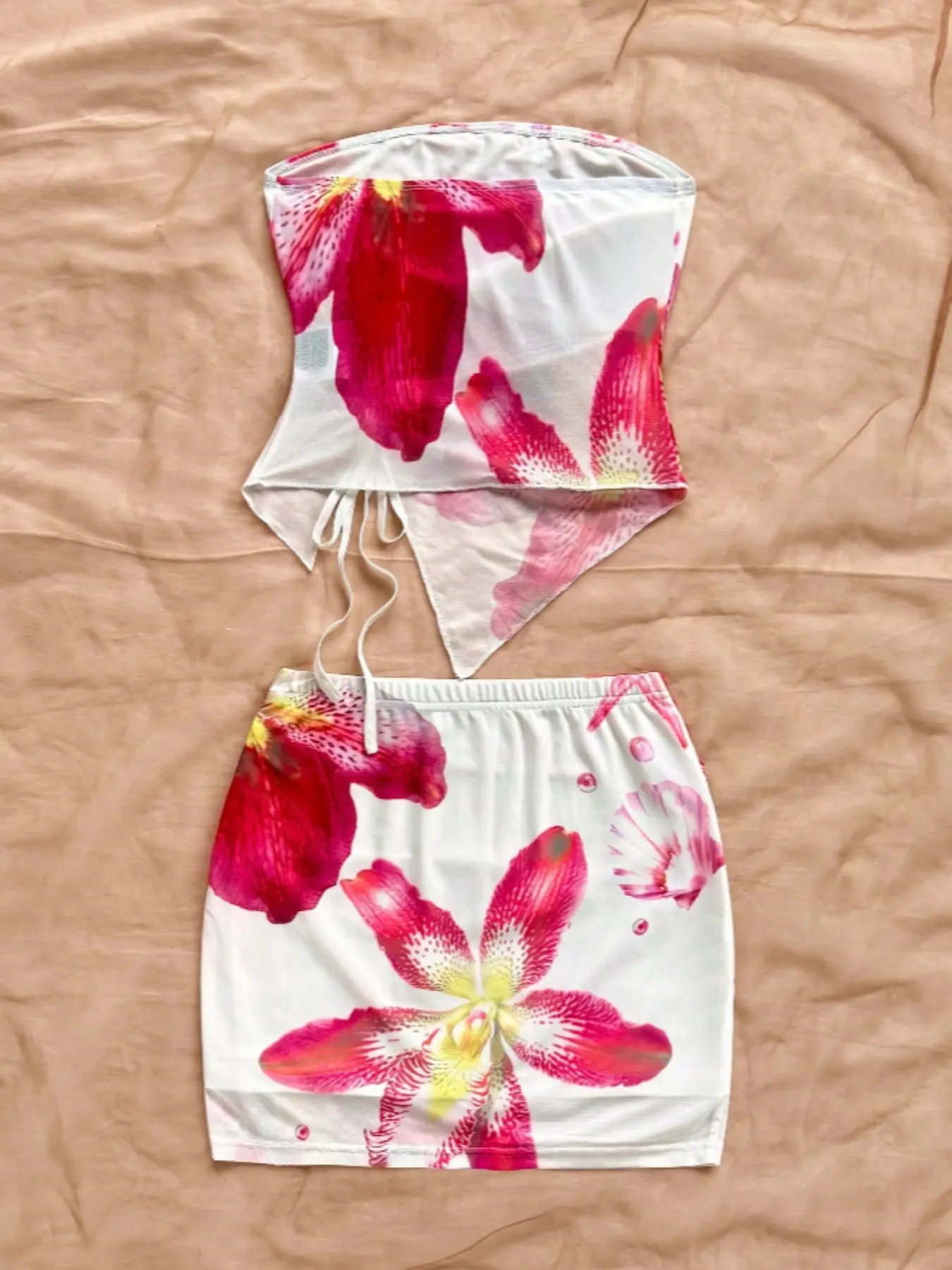 Romantic Floral Print Bandeau Eyelet Mesh Backless Top, Adjustable Drawstring Design, Sleeveless & Strapless Style, Perfect for Summer, Fashion