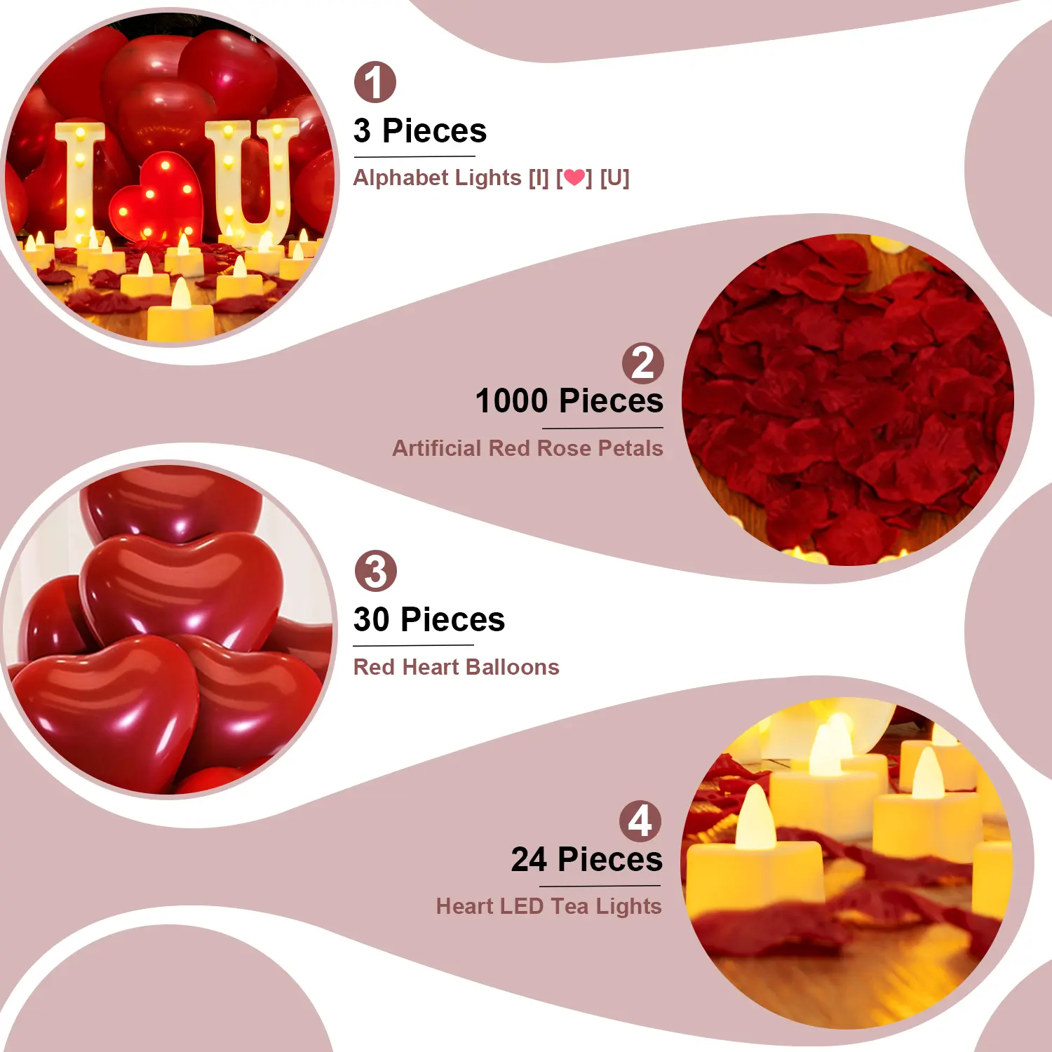Get ready to make your proposal ceremony unforgettable! This kit includes 3 light-up letters forming "I LOVE U," 24 LED tea lights, 1000 burgundy fake rose petals, and 30 burgundy love balloons. Each letter has 1 or 2 holes for easy hanging. The LED lights are lightweight, durable, and have a flat surface. Perfect for creating a stunning atmosphere for your special day.