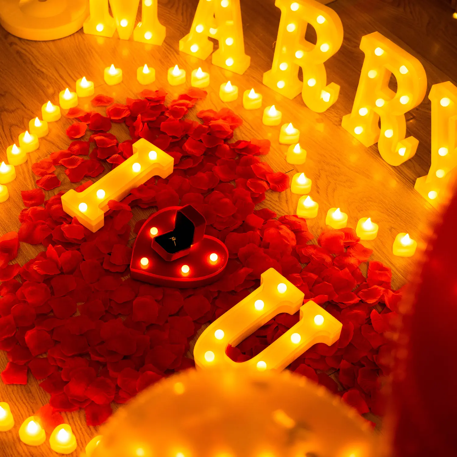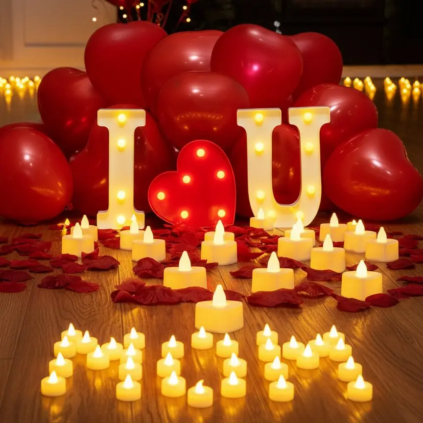 Place the light-up letters in the room, scatter the rose petals, and set up the tea lights. Add red balloons floating on the ceiling. Your loved one's heart will surely be hit when she sees "I LOVE U." Create a romantic and unforgettable proposal experience with this complete set.