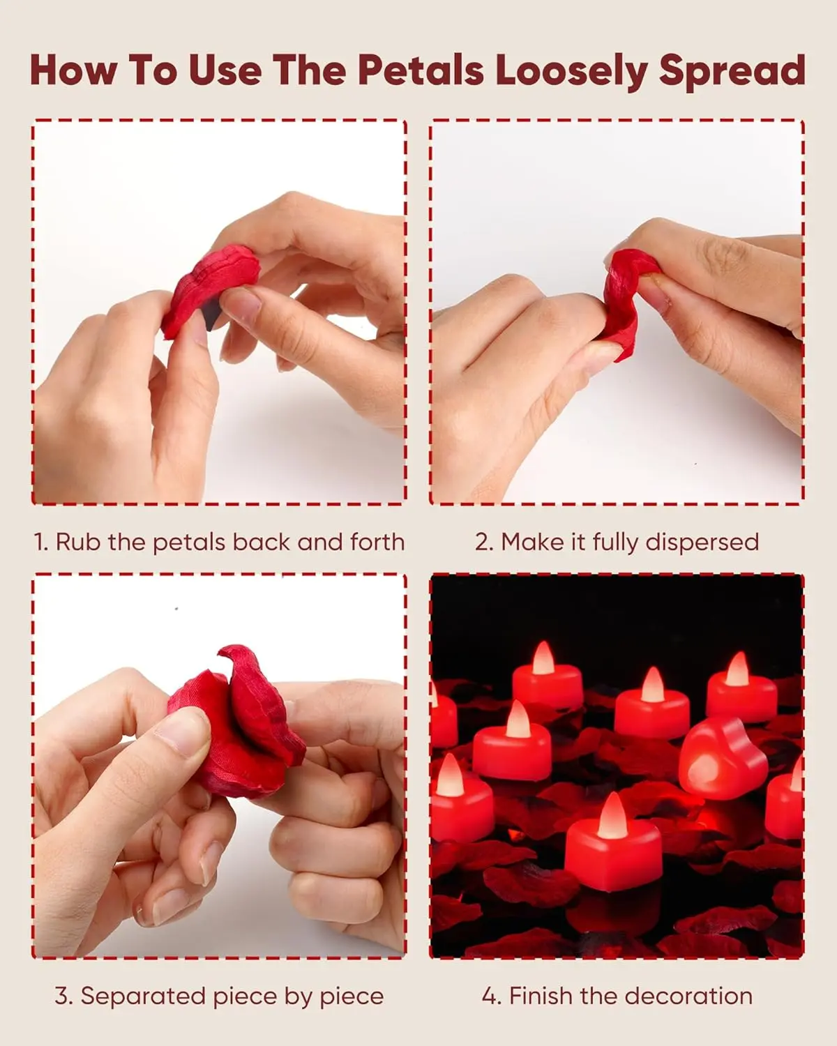 Our uniquely designed heart-shaped electronic tea lights emit a captivating red light. They effortlessly set a romantic and gentle atmosphere for your special occasions. The high-quality red-black artificial rose petals are made from premium, non-toxic polyester, ensuring they are realistic, easy to clean, and odorless.