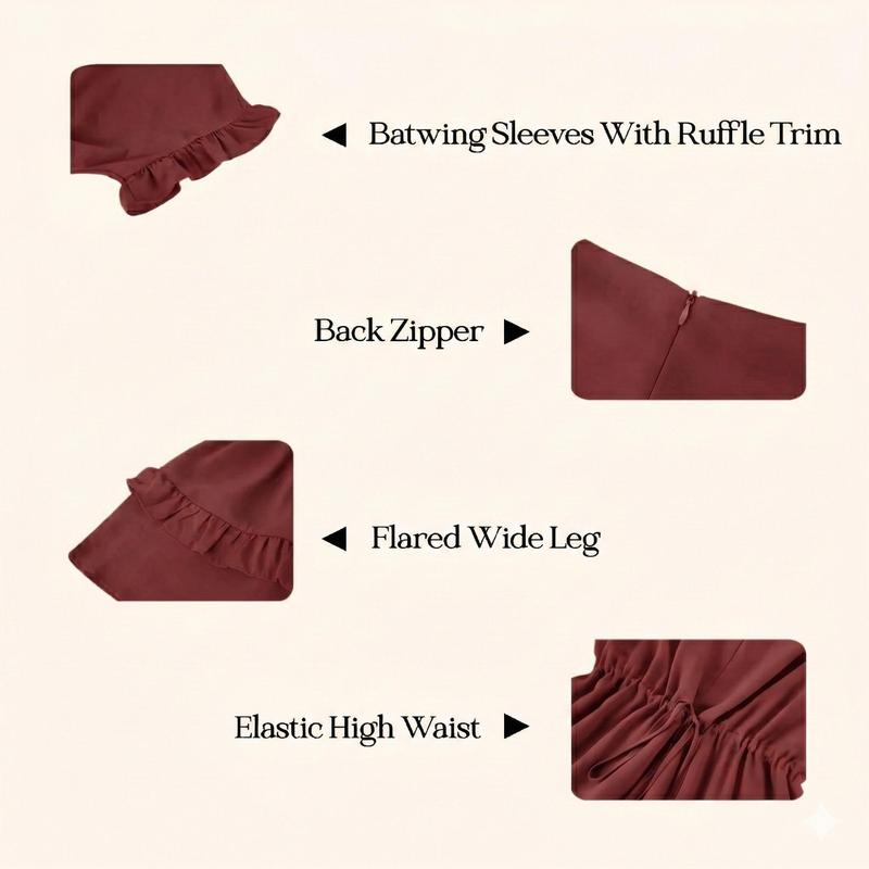 ·It features deep v neckline, batwing sleeves with ruffle trim, elastic high waist, flared wide leg, back zipper.