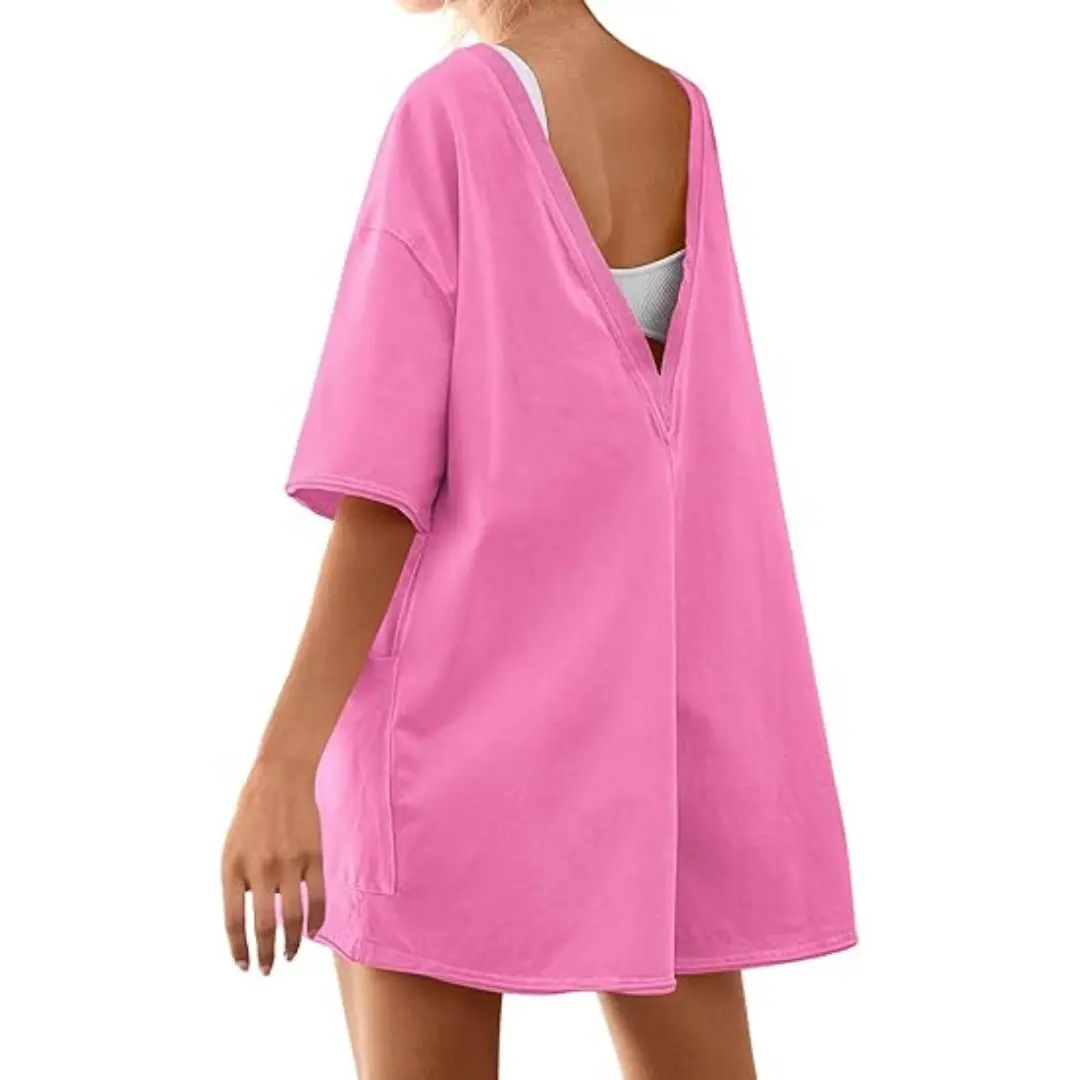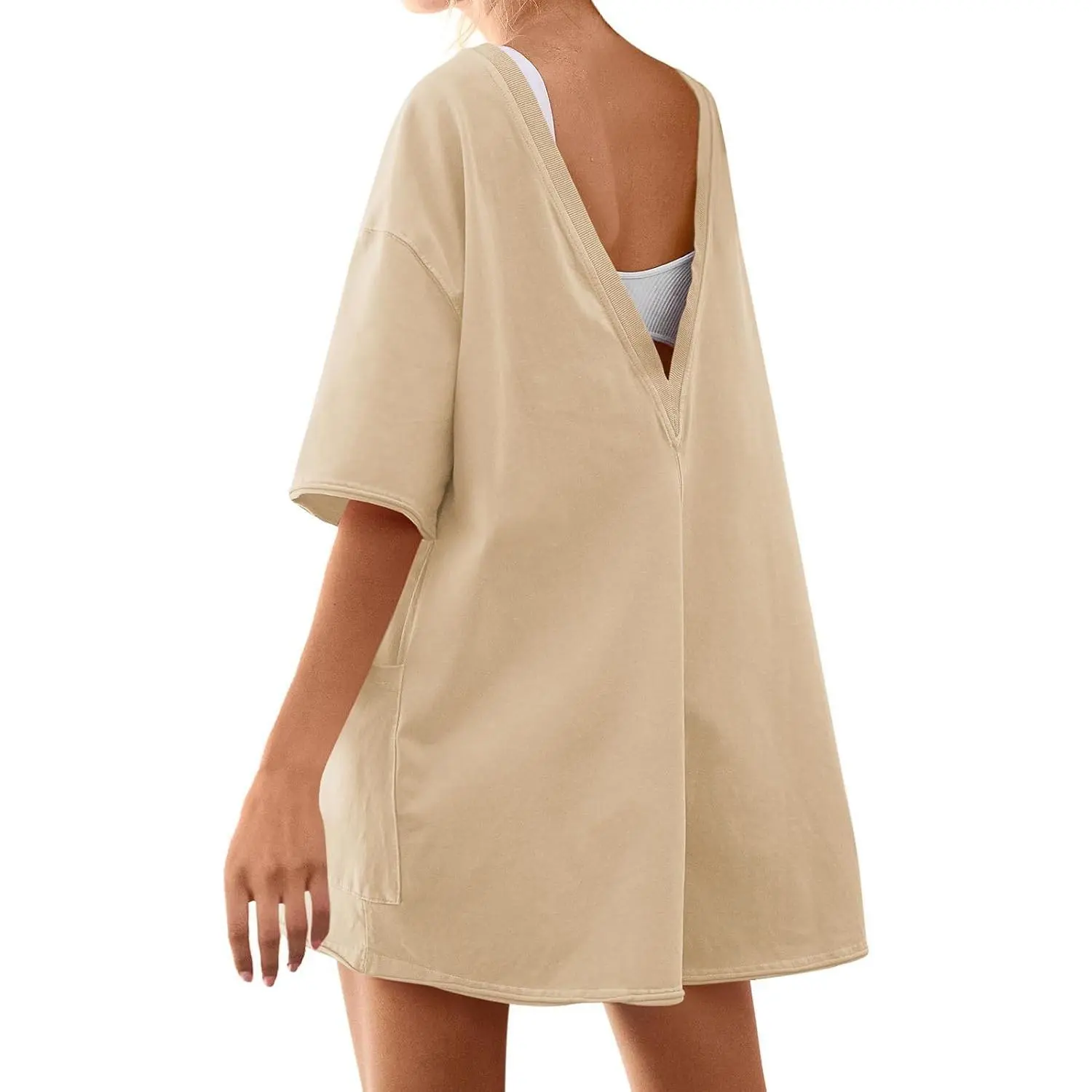 Womens Rompers Back V Neck Half Sleeve Jumpsuit Tee Rompers with Pockets
